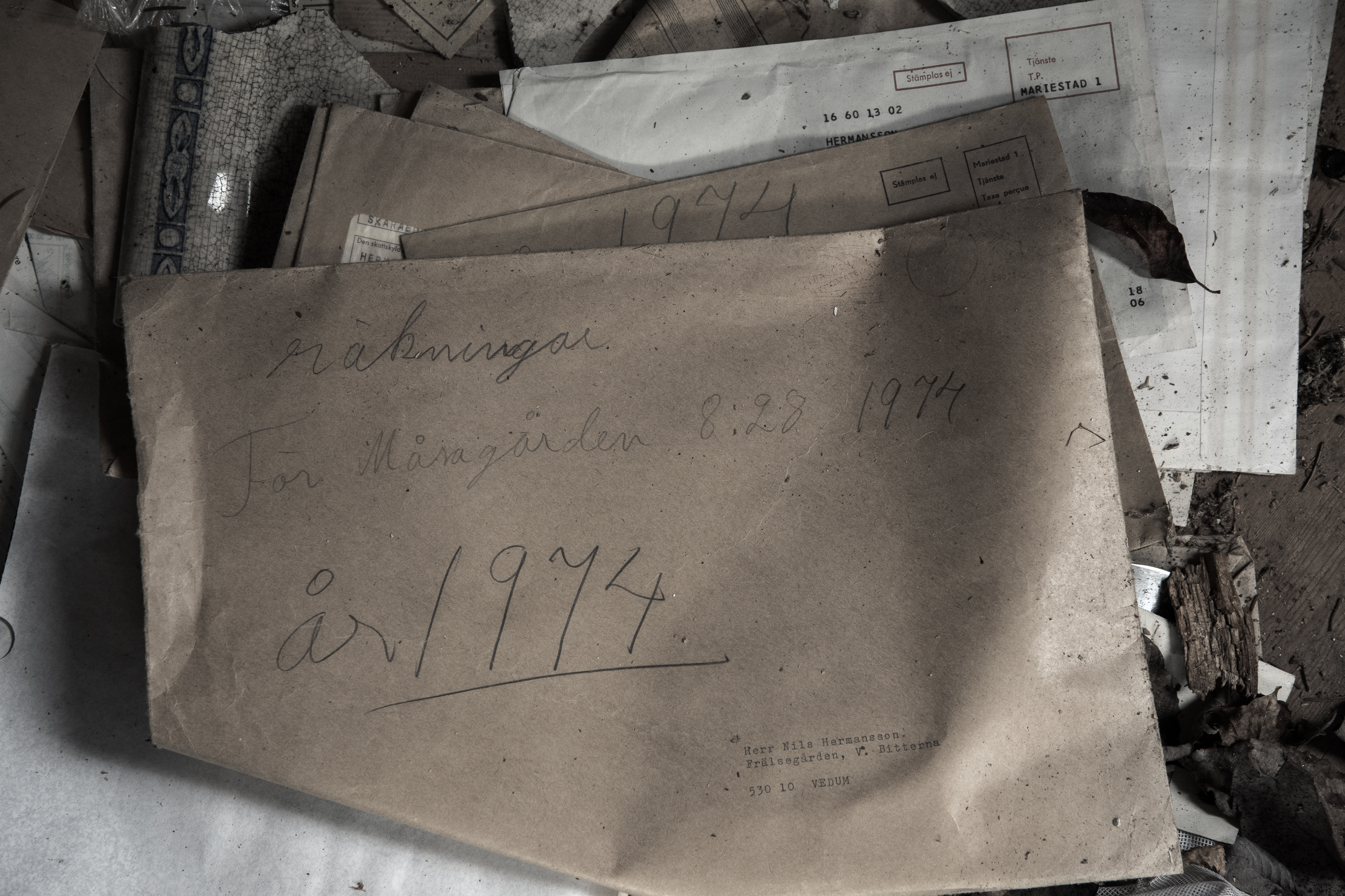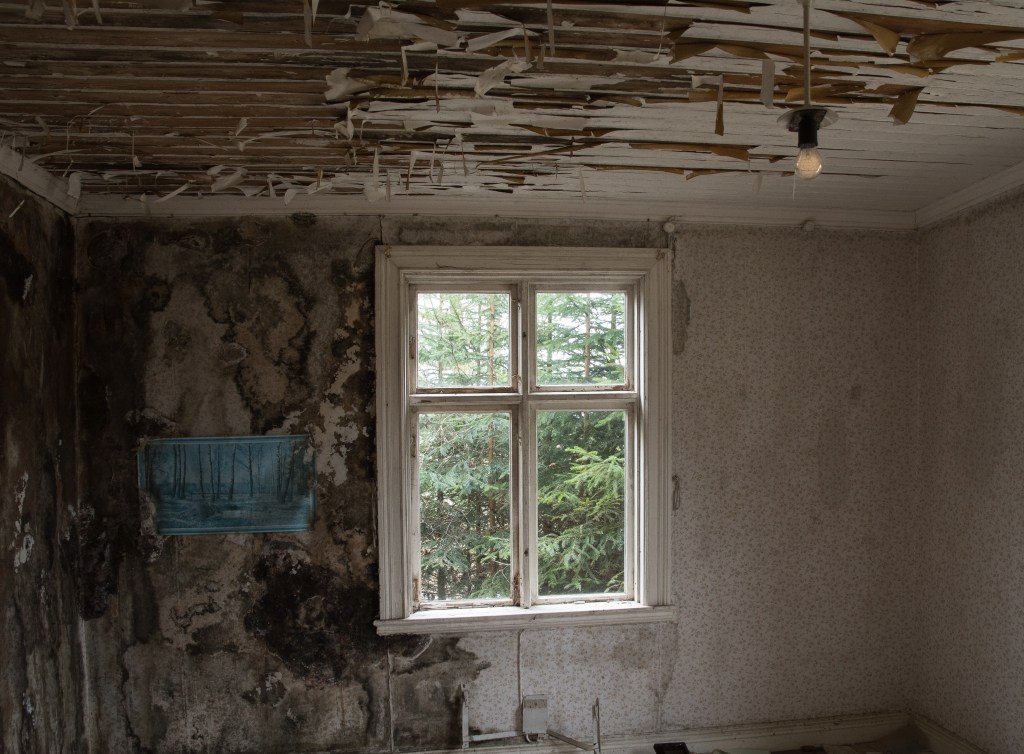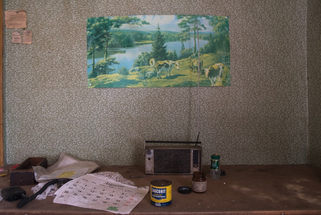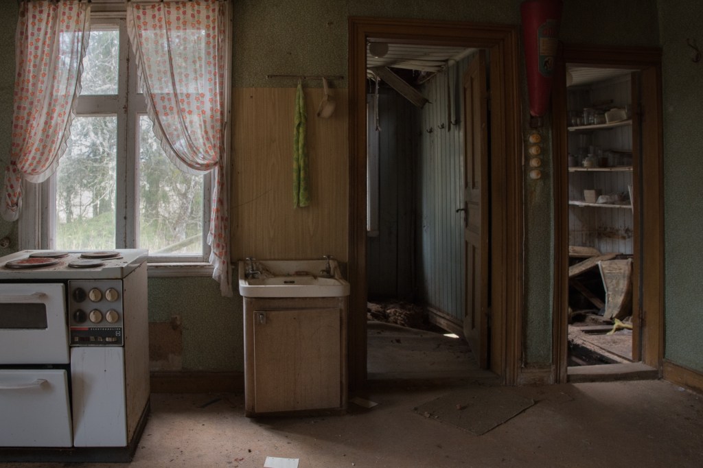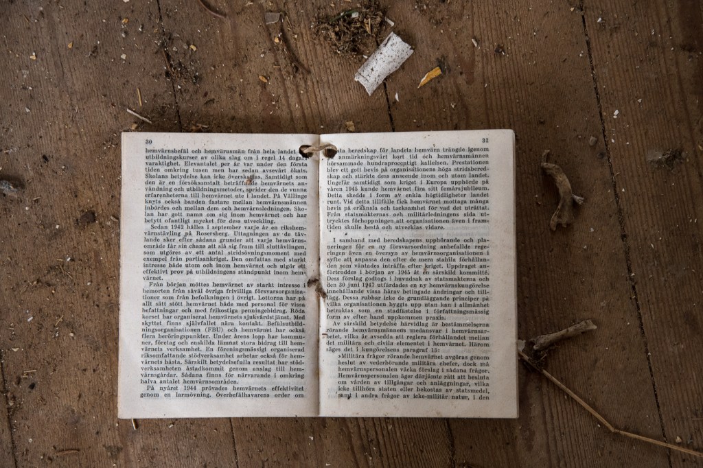 Vad är väl mer passande då än att lägga in lite bilder från något annat nästan dött, nämligen ödehuset jag besökte idag. Jag var där för två-tre år sedan och blev förvånad över hur fasligt igenväxt det blivit på såpass kort tid, och hur långt förfallet gått. Bitar av taket i ett par rum hade rasat, och det saknades golv i andra rum. Det var med stor försiktighet och lite hjärtklappning jag tryckte mig igenom buskage och granar för att komma nära. När jag tog mod till mig och gick in i huset hade hjärtfrekvensen ökat markant, ”detta är inte jag” tänkte jag…Förra gången jag var här skulle inte ens vilda hästar fått mig att gå in, vad som hände idag förstår jag inte ens själv. Nyfikenheten blev kanske för starkt? Trots att det inte är helt enkelt att forcera växtligheten runt huset verkar folk ha varit här och rotat runt, för mängder med papper som ägaren haft liggande kvar var nu utspridda över golven. Räkningar från 1974 m.m. tillsammans med recept och – som jag tror- någon bok om hemvärnet. Efter en knapp timma drog jag mig tillbaka ut ur hus och snår, med en tanke om att återkomma till husets verkstad som fanns förra gången jag var här, men som jag denna gången inte kikade efter. Må väl!