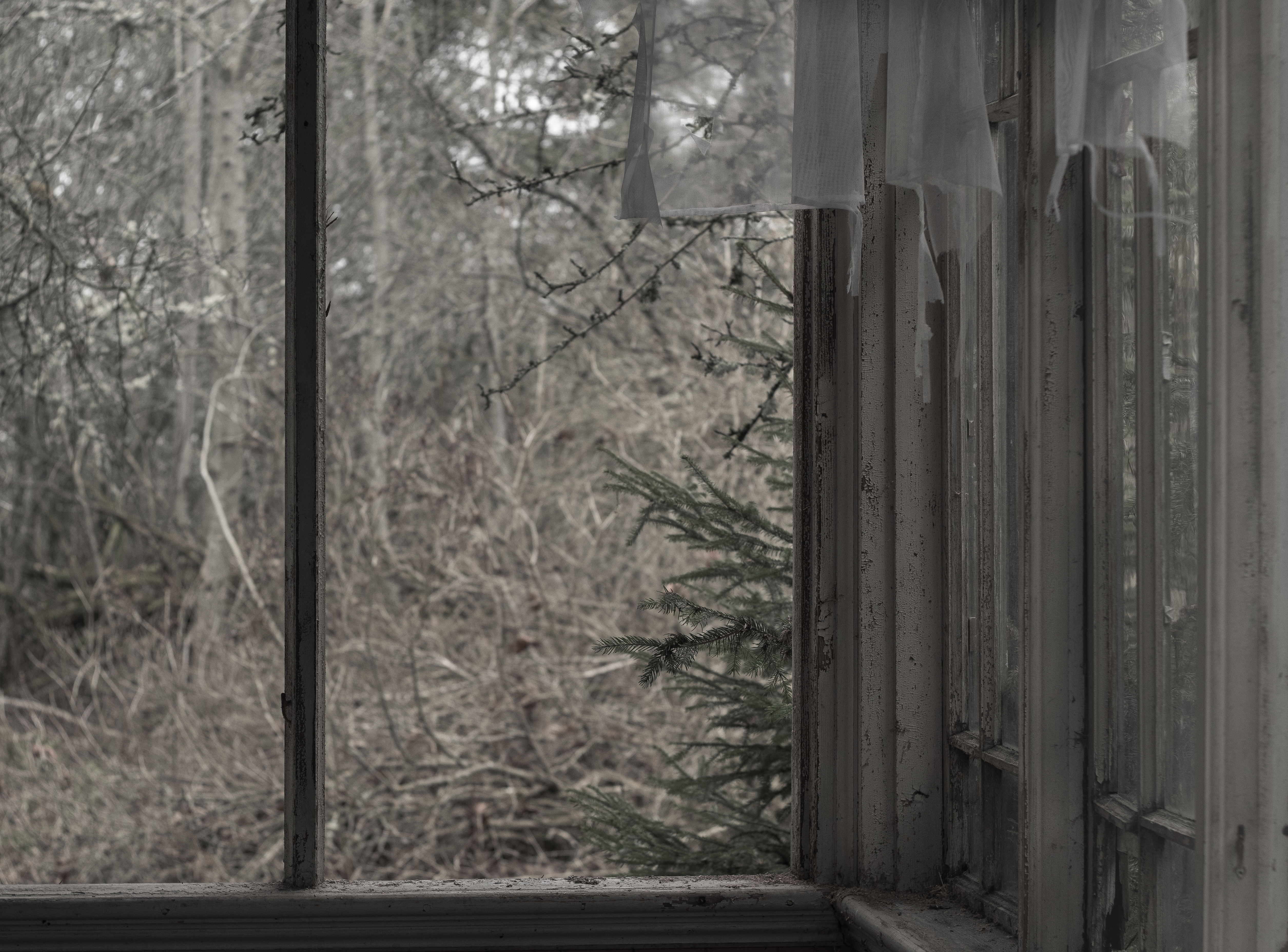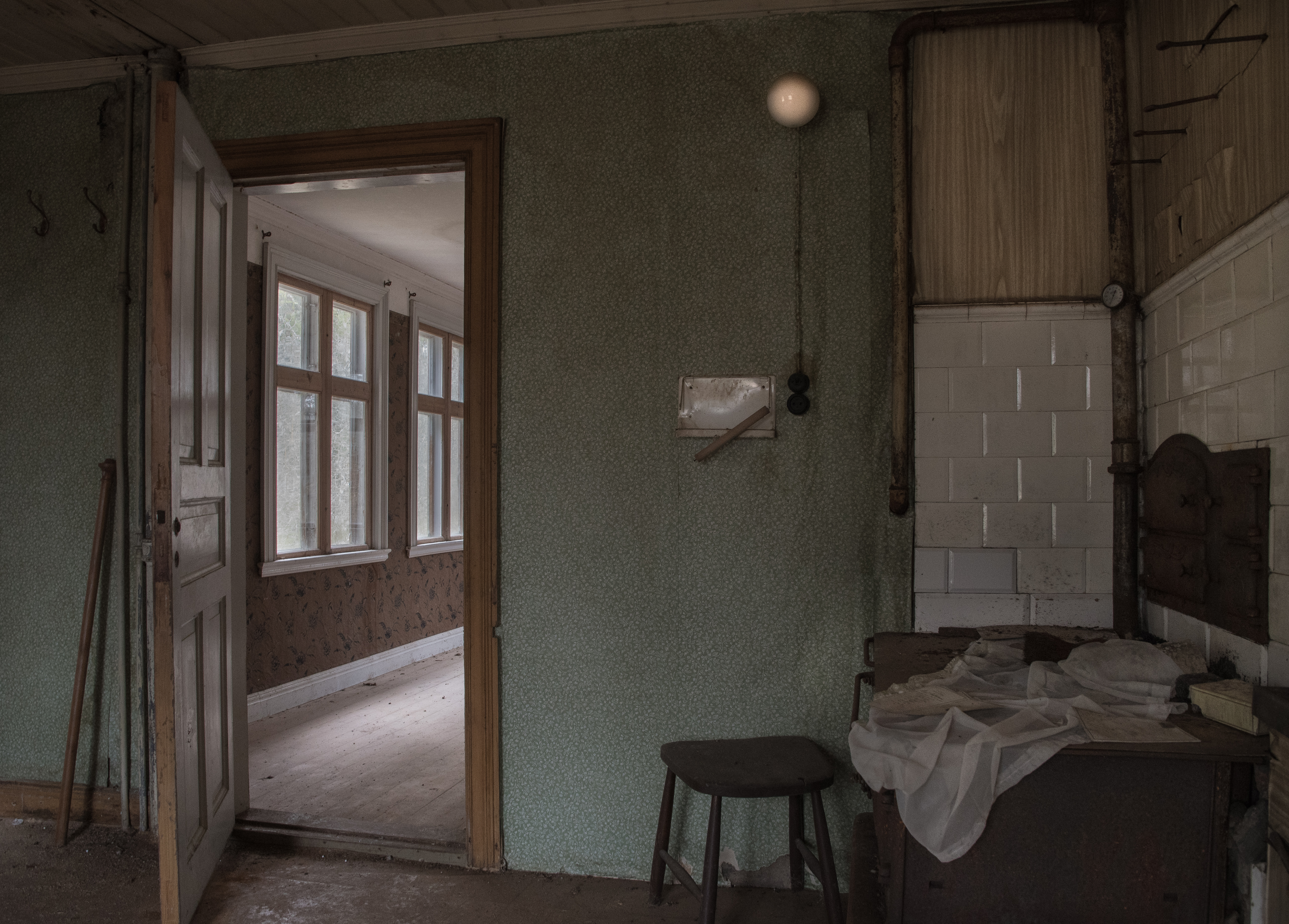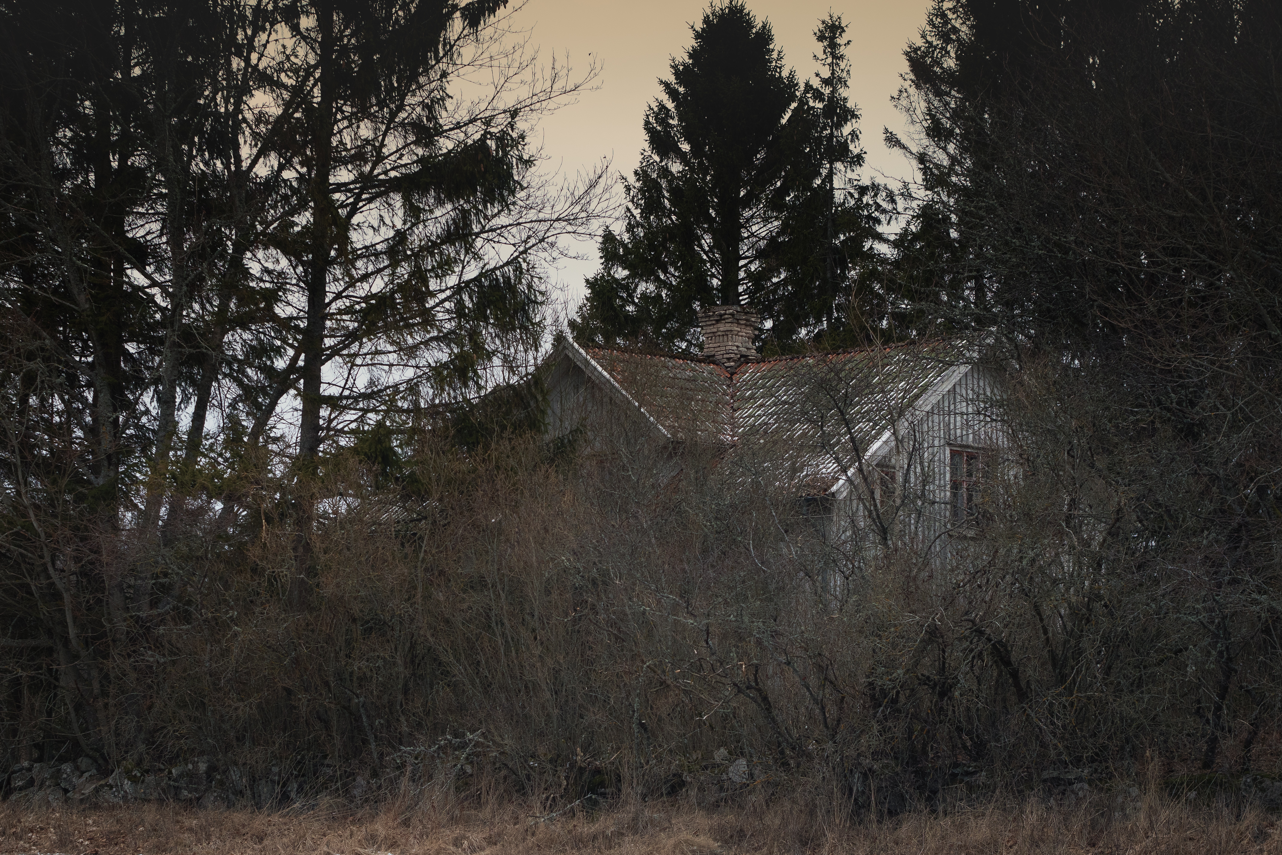 Vad är väl mer passande då än att lägga in lite bilder från något annat nästan dött, nämligen ödehuset jag besökte idag. Jag var där för två-tre år sedan och blev förvånad över hur fasligt igenväxt det blivit på såpass kort tid, och hur långt förfallet gått. Bitar av taket i ett par rum hade rasat, och det saknades golv i andra rum. Det var med stor försiktighet och lite hjärtklappning jag tryckte mig igenom buskage och granar för att komma nära. När jag tog mod till mig och gick in i huset hade hjärtfrekvensen ökat markant, ”detta är inte jag” tänkte jag…Förra gången jag var här skulle inte ens vilda hästar fått mig att gå in, vad som hände idag förstår jag inte ens själv. Nyfikenheten blev kanske för starkt? Trots att det inte är helt enkelt att forcera växtligheten runt huset verkar folk ha varit här och rotat runt, för mängder med papper som ägaren haft liggande kvar var nu utspridda över golven. Räkningar från 1974 m.m. tillsammans med recept och – som jag tror- någon bok om hemvärnet. Efter en knapp timma drog jag mig tillbaka ut ur hus och snår, med en tanke om att återkomma till husets verkstad som fanns förra gången jag var här, men som jag denna gången inte kikade efter. Må väl!