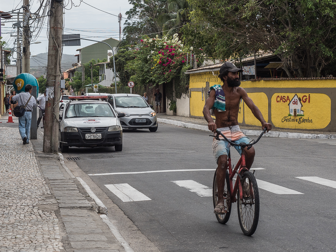 Tempot var långsamt oerhört långsamt för en nordbo där allt ska vara så effektivt som möjligt. Här var det bara att lugna ner sig och ta det lugnt. Riktigt lugnt och Länge! Nyttigt för själen tror jag alldeles bestämt. Trafikregler tycktes vara mer ett förslag på hur ett fordon skulle kunna framföras, än en bestämmelse om hur de måste framföras. Människorna var vänliga, och 99% hade flip-flop på fötterna som tillsammans med ett par short och ett linne var den absolut vanligaste outfiten. Ingen kunde prata engelska eller franska. Inte i butikerna, inte på bussarna eller på restaurangerna. Nu förstår jag hur personer som kommer till ett främmande land utan att kunna göra sig förstådda/förstå något alls känner sig, nämligen totalt utlämnad. Även detta en nyttig erfarenhet! Som ni förstår finns det hur mycket som helst att berätta, men jag sätter punkt här med några bilder på de vanliga människorna på gatorna under dagtid i staden Arraial da Cabo. I morgon måndag återgår allt till det normala igen, vi får se hur det ter sig efter all ledighet. Ha´en fin vecka. / Inger
