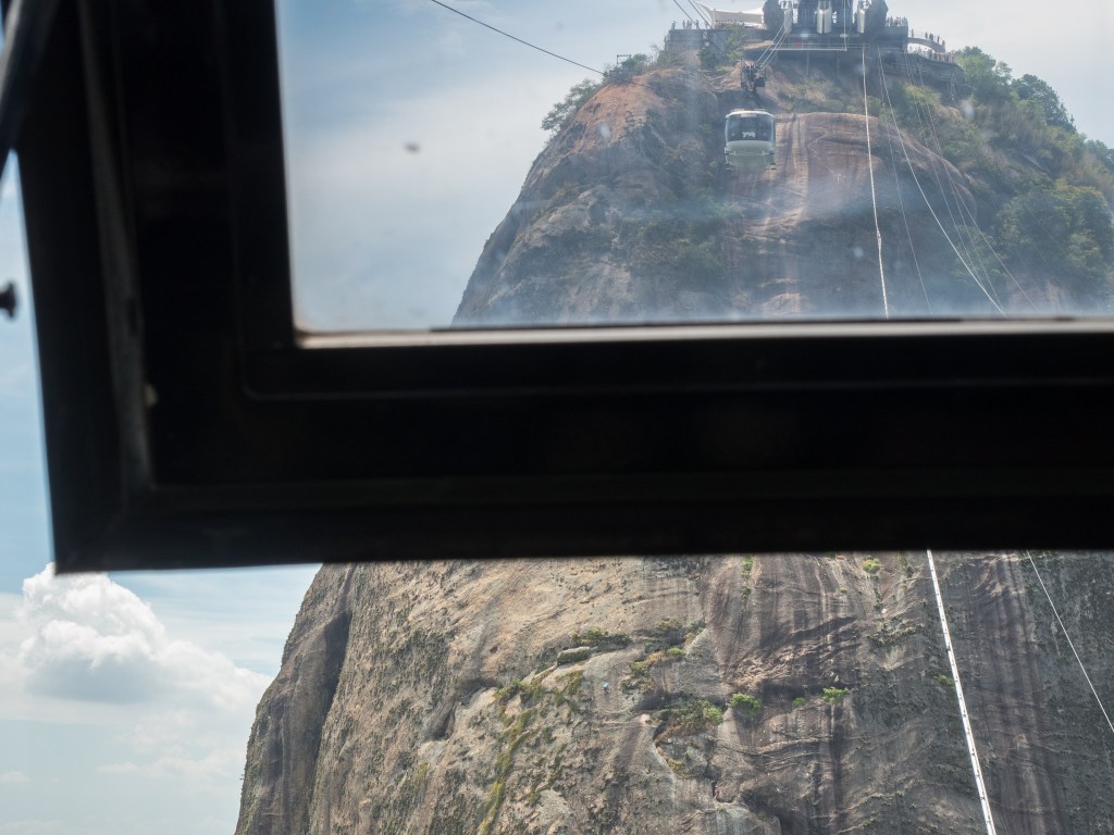 Glada i hågen klev vi rakt ut i hettan från hotellets luftkonditionerade och svala reception. Att gå in i väggen har definitivt fått en ny betydelse för mig efter denna dagen. 36 grader i skuggan+ 98% luftfuktighet på morgonen! Det tog inte många minuter innan klänningen och allt därunder var lagom genomsvettigt. Taxi tillkallades omgående för avfärd till Sockertoppen, och enligt taxichauffören var trafiken ovanligt lugn även denna dag på grund av festivalens efterdyningar. Vi hade läst på nätet att köerna till linbanan upp till Sockertoppen kunde vara monstruösa, men icke sa nicke, några köer att tala om möttes vi inte av. Vi fick åka med redan den första gondolen som kom in till stationen, och första resan upp till första delen (Morro da Urca) på Sockertoppen. Den tog kanske 4-5 minuter och efter hand minuterna tickade iväg kom vi oss längre och längre upp, med en härlig utsikt över Rio som belöning. Nästa gondol tog oss till toppen på kanske lika många minuter, och trots höjden höll sig både mage och höjdskräck förvånansvärt lugna i den gungande vagnen. Tack och lov för det! På en av de senare bilderna kan ni se en ensam person i blå jacka klättra upp för den spikraka väggen till toppen. Hualiga! Vi såg honom aldrig komma upp, men jag hoppas det gick vägen för han/henne, men undrar hur man ens kan komma på tanken att göra en sådan klättring ensam i den hettan?