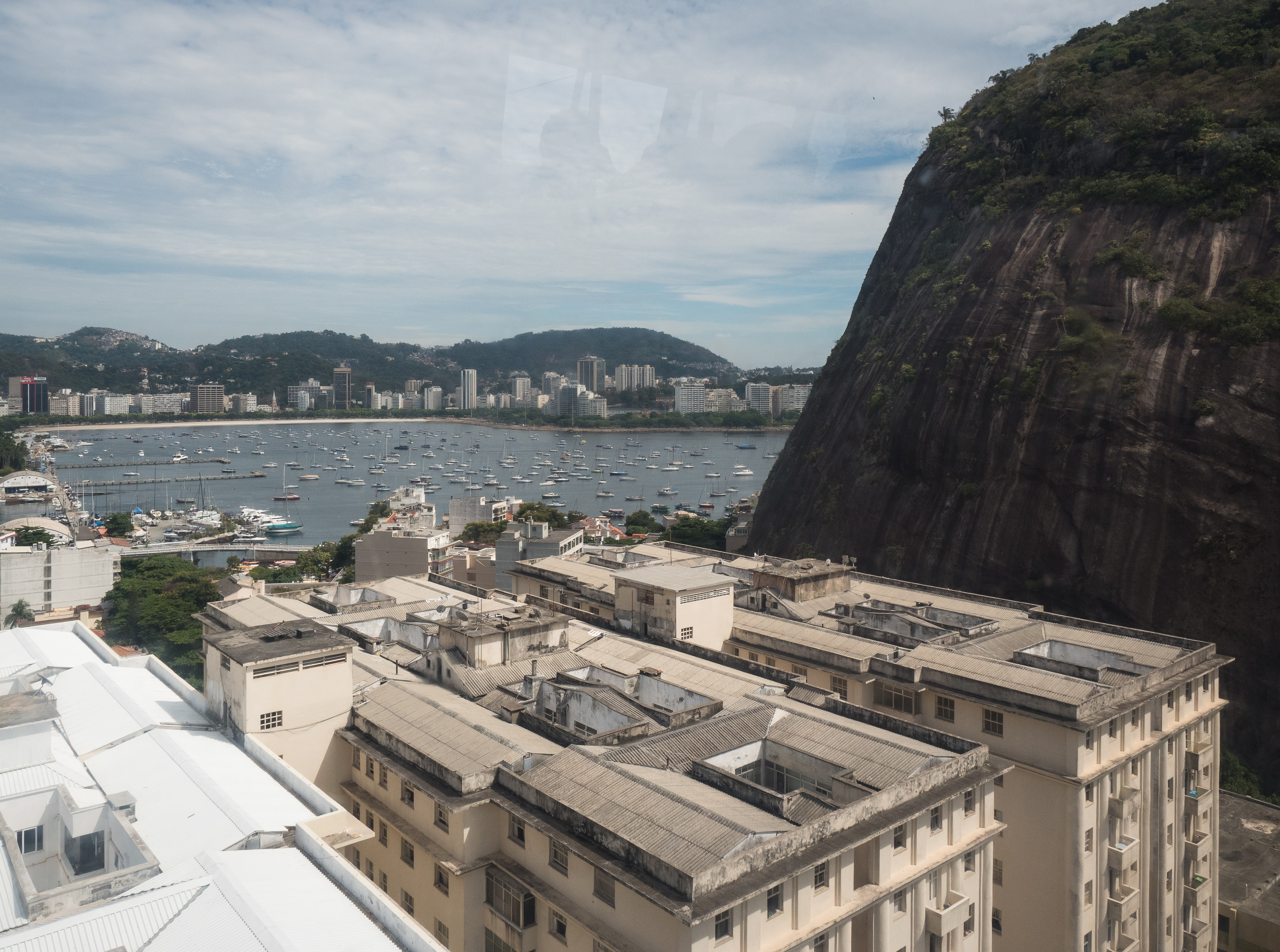 Glada i hågen klev vi rakt ut i hettan från hotellets luftkonditionerade och svala reception. Att gå in i väggen har definitivt fått en ny betydelse för mig efter denna dagen. 36 grader i skuggan+ 98% luftfuktighet på morgonen! Det tog inte många minuter innan klänningen och allt därunder var lagom genomsvettigt. Taxi tillkallades omgående för avfärd till Sockertoppen, och enligt taxichauffören var trafiken ovanligt lugn även denna dag på grund av festivalens efterdyningar. Vi hade läst på nätet att köerna till linbanan upp till Sockertoppen kunde vara monstruösa, men icke sa nicke, några köer att tala om möttes vi inte av. Vi fick åka med redan den första gondolen som kom in till stationen, och första resan upp till första delen (Morro da Urca) på Sockertoppen. Den tog kanske 4-5 minuter och efter hand minuterna tickade iväg kom vi oss längre och längre upp, med en härlig utsikt över Rio som belöning. Nästa gondol tog oss till toppen på kanske lika många minuter, och trots höjden höll sig både mage och höjdskräck förvånansvärt lugna i den gungande vagnen. Tack och lov för det! På en av de senare bilderna kan ni se en ensam person i blå jacka klättra upp för den spikraka väggen till toppen. Hualiga! Vi såg honom aldrig komma upp, men jag hoppas det gick vägen för han/henne, men undrar hur man ens kan komma på tanken att göra en sådan klättring ensam i den hettan?