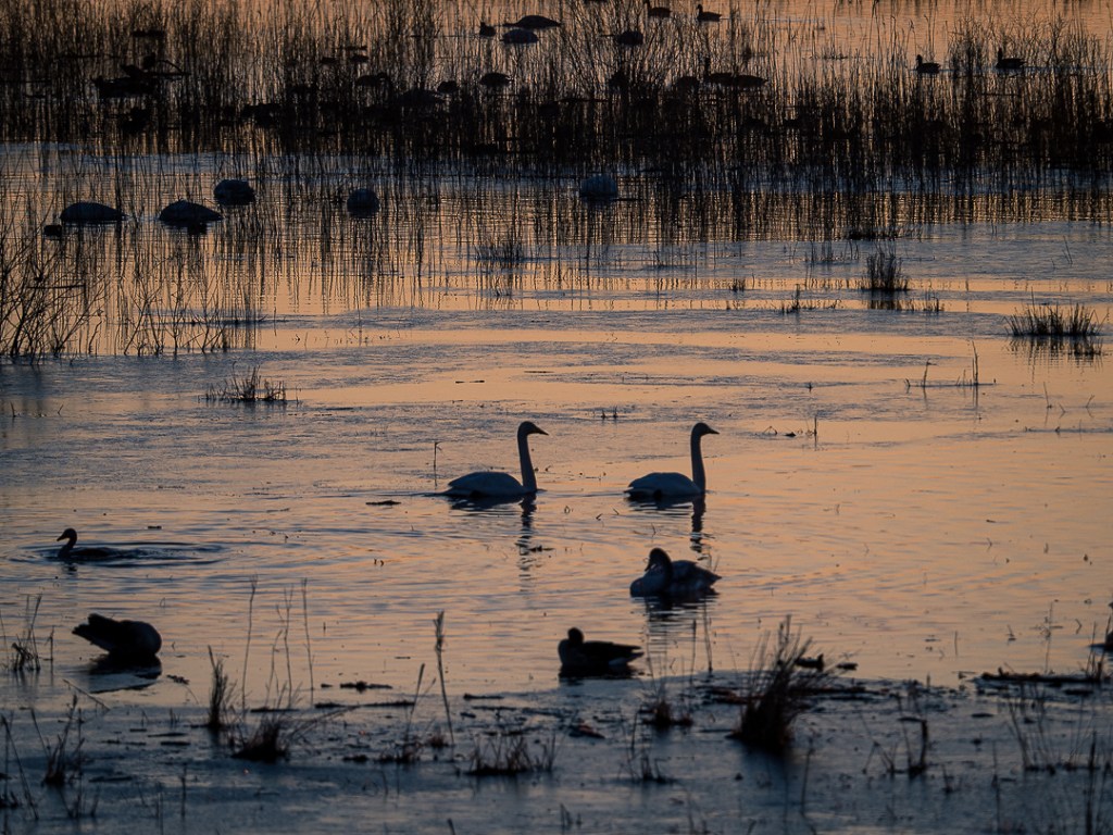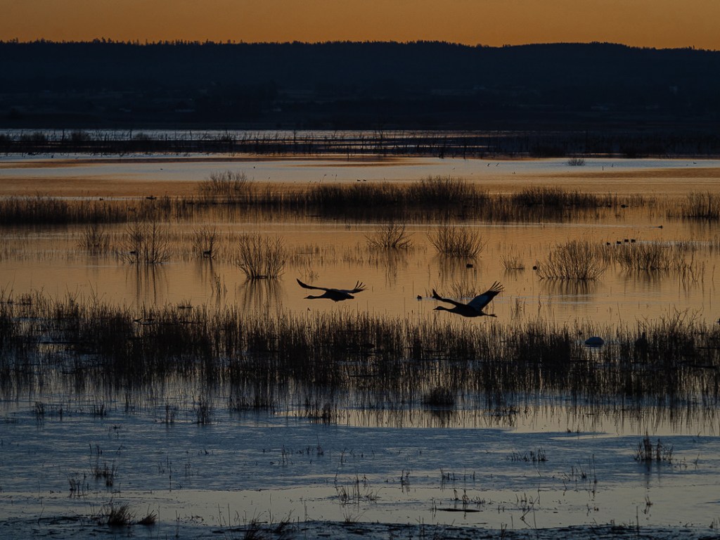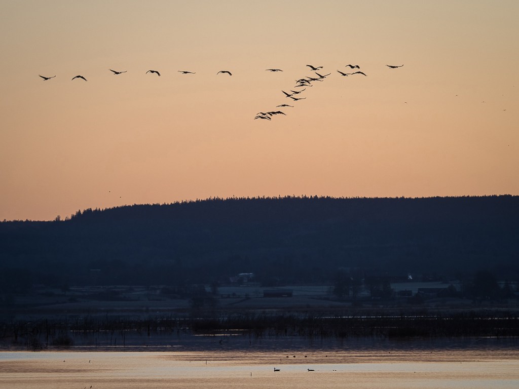 Vid tidig ankomst, runt 05.30, så vilar en mystik över området. Inte en människa mer än vi tre är ute än så länge, trots att husbilarna står parkerade på rad alldeles intill sjön. Varför är dom inte ute? Tranorna är på inflygning till sjön från nattens sovplatser i skogen, de ropar ikapp med gässen och de andra fåglarna. Ljuset är fantastiskt och det är isande kallt med hög klar luft. LIVSKVALITET!