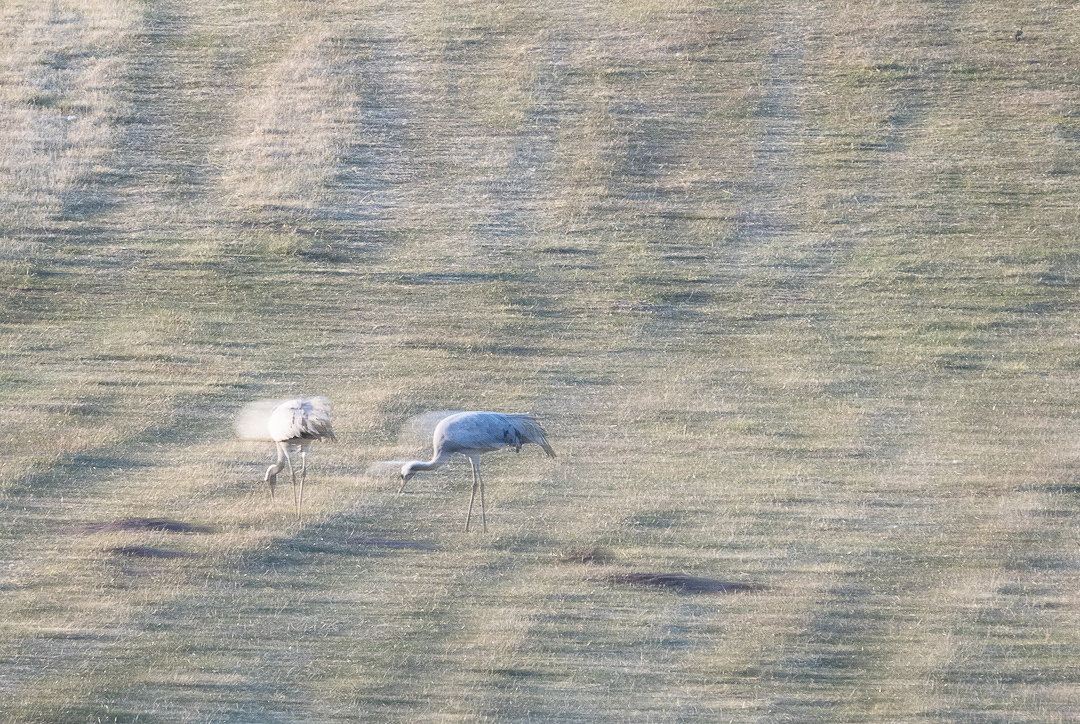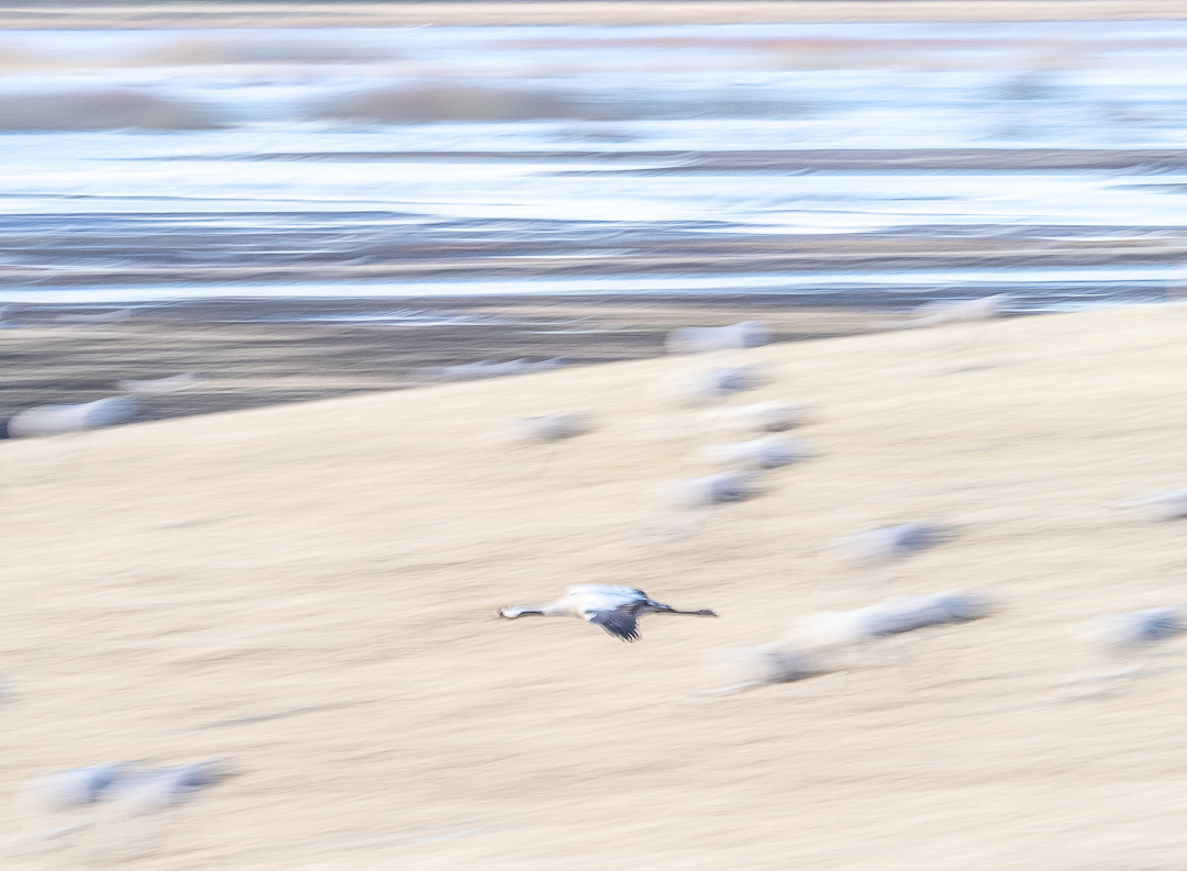 När man försöker skapa någon annan form av bild av tranorna än de mer ”traditionella”så har jag i dessa fallen bl.a. överexponerat och rört lite på kameran. På någon bild satte jag på det inbyggda ND-filtret vilket ger en viss effekt innan filtret stabiliserat sig. Bilderna är medvetet ”lite” oskarpa och har denna gången inte kommit till av en slump.