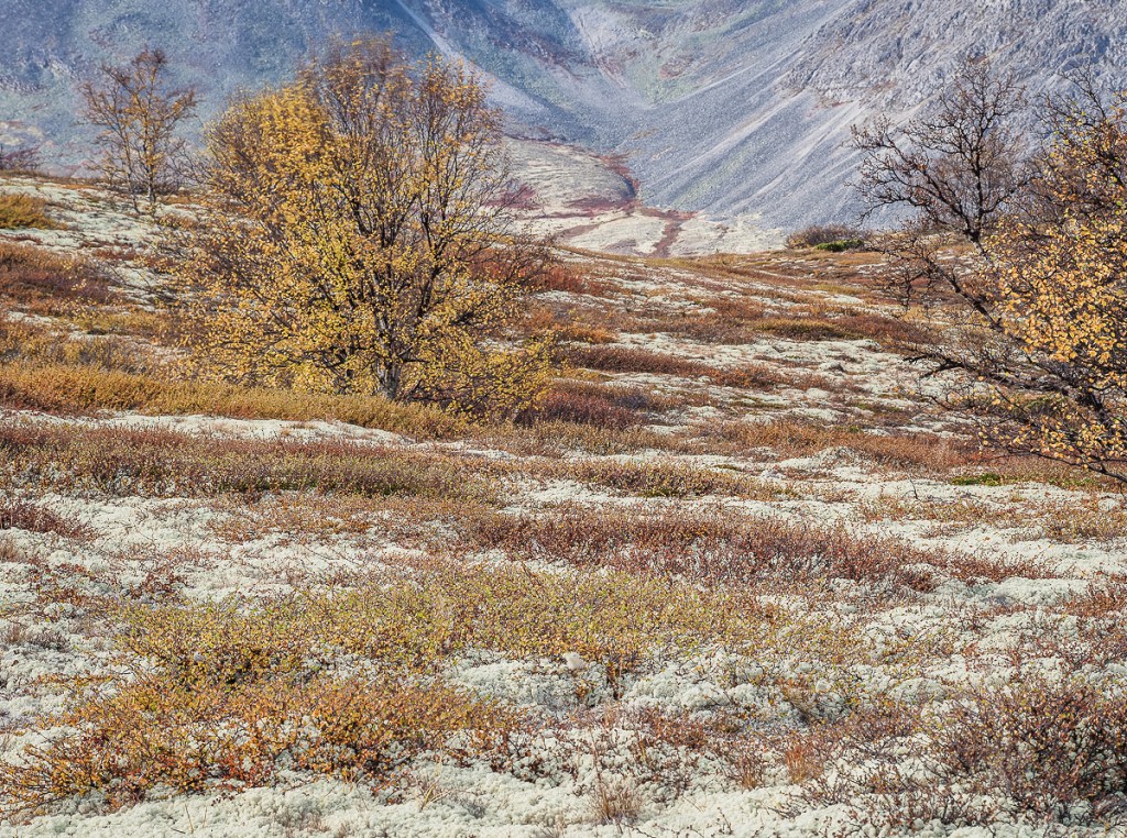 Dagarna på denna plats blir precis så full av aktiviteter som man själv önskar. Man behöver inte ta bilen någonstans om man inte absolut vill, det räcker att öppna dörren i hyttan så befinner man sig mitt i det stora alltet. Du kan lulla runt i närområdet hela dagen, och har du tur stöter du på en älg. Förutom de storslagna vyerna finns också de alldeles fantastiska mikrovyerna, ty marken är täckt av underbara lavar och bladverk och är ett eldorado för en makrofotograf. Jag längtar redan till nästa besök.