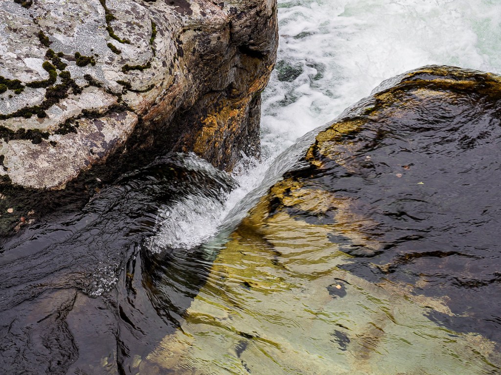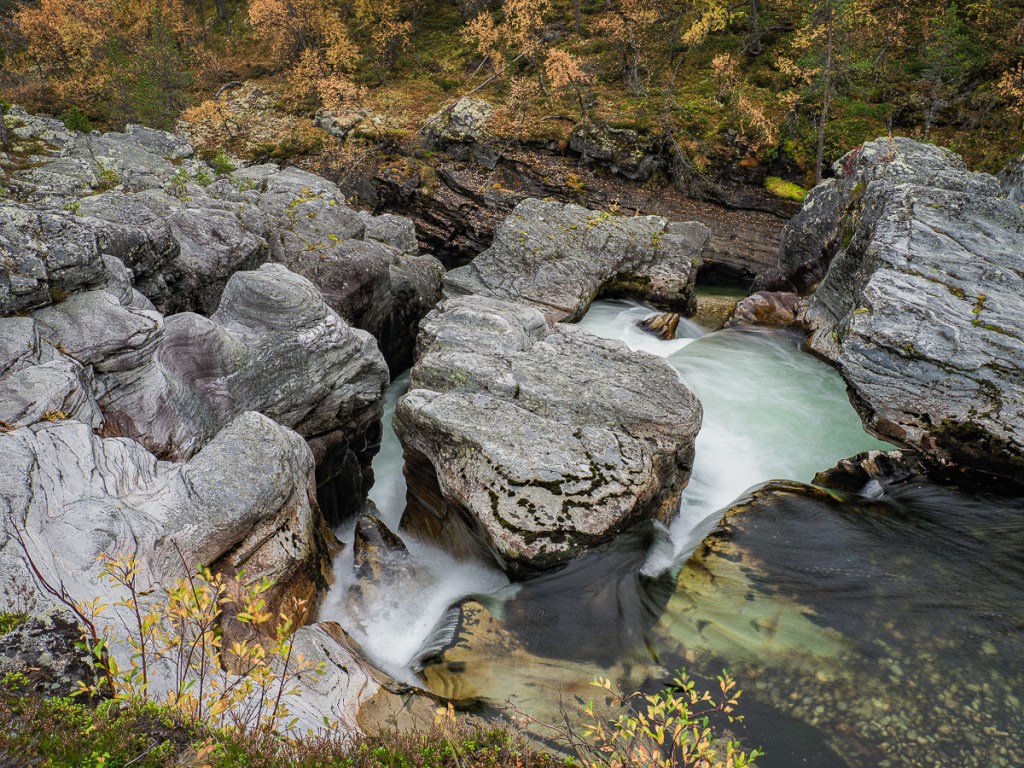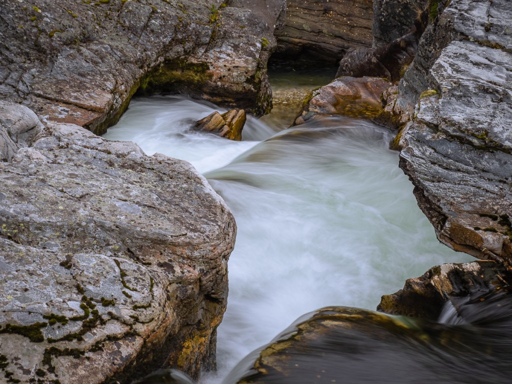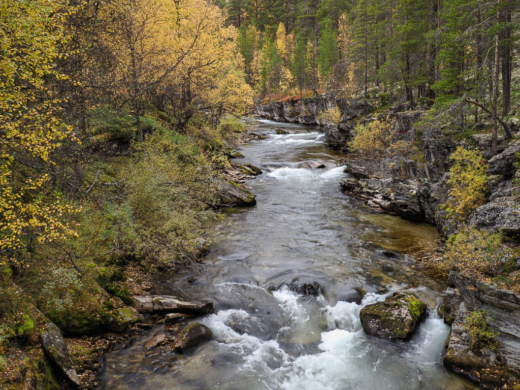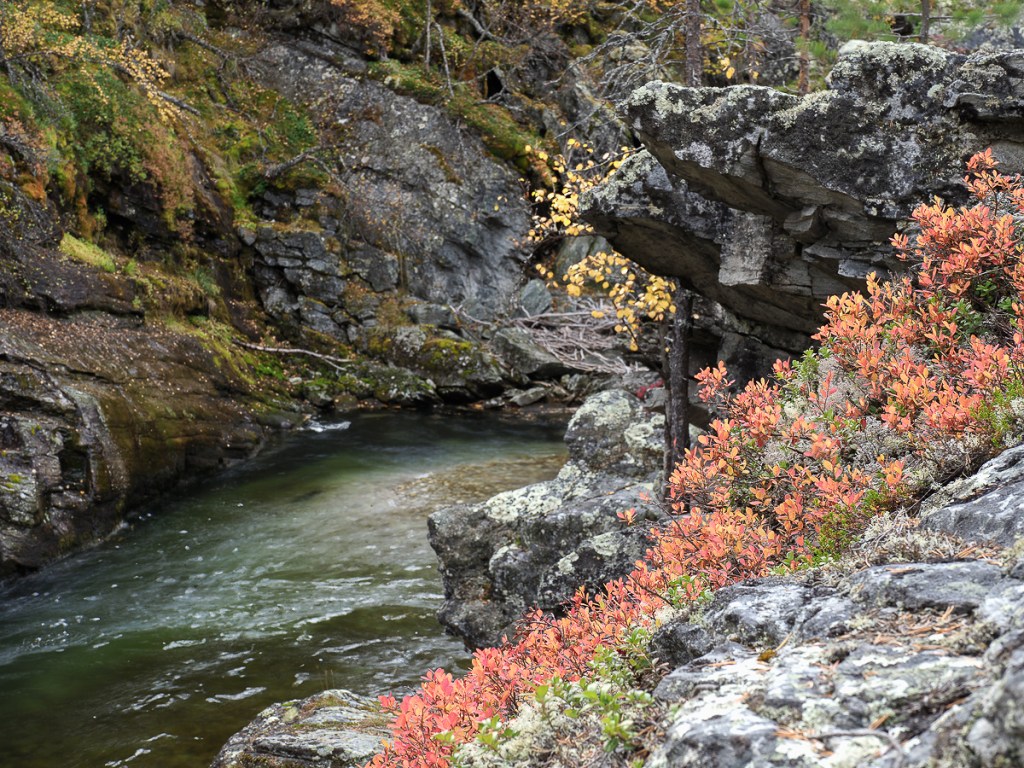 Till syvende och sist kom vi till vårt mål som visade sig vara ett utomordentligt spännande sådant. Forsen Atne hade format stenblock i de mest förföriska former och strömmade rätt vilt genom ”canyonen”, men lugnade sig strax till ett något mer stillsamt flytande vattendrag. Runt omkring fanns myrmark och sköna träd badande i en för dagen strålade sol, och längs kanterna kring Atne fanns färggrann växtlighet. En något svårfotad plats men utmaningar att ju till för att lösas, och jag tycker det var spännande att försöka. Det får bli fler försök nästa år hoppas jag.