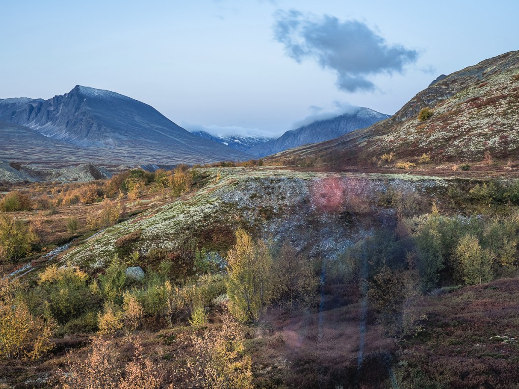En annan ”väg” ledde till en alldeles fantastisk liten sjö med de mäktiga fjällen i bakgrunden, och tuvull som stod vita i den väldigt orange växtligheten. Vi fastnade en lång stund med kamerorna på bägge dessa ställen. Vi noterade att norrmän kan ha byggt hytter precis överallt, de fanns längs våra villovägar placerade på enskilda och vackra platser.
