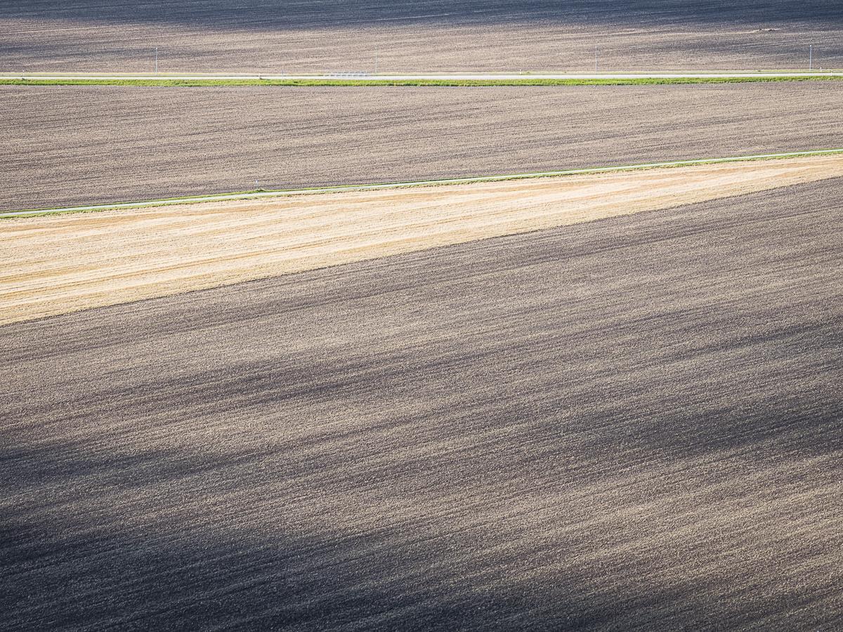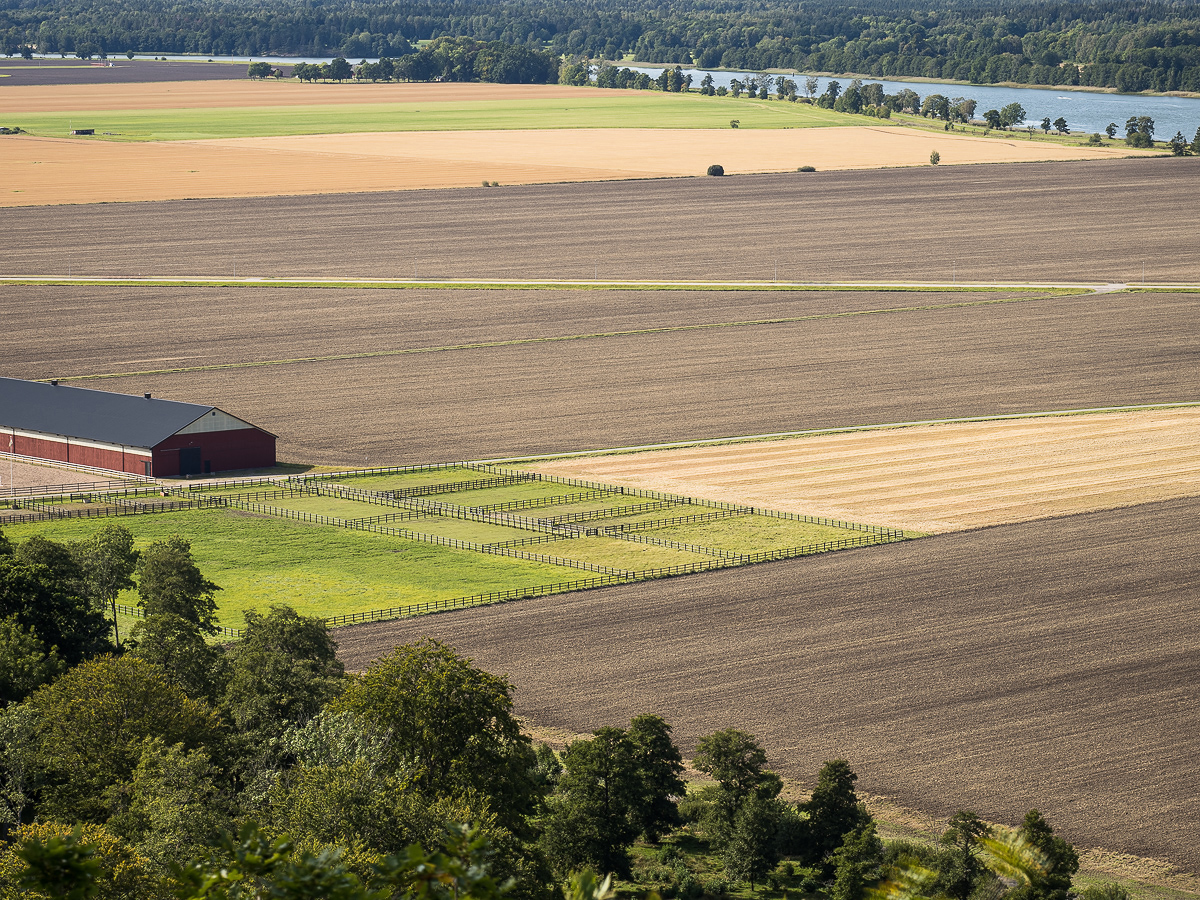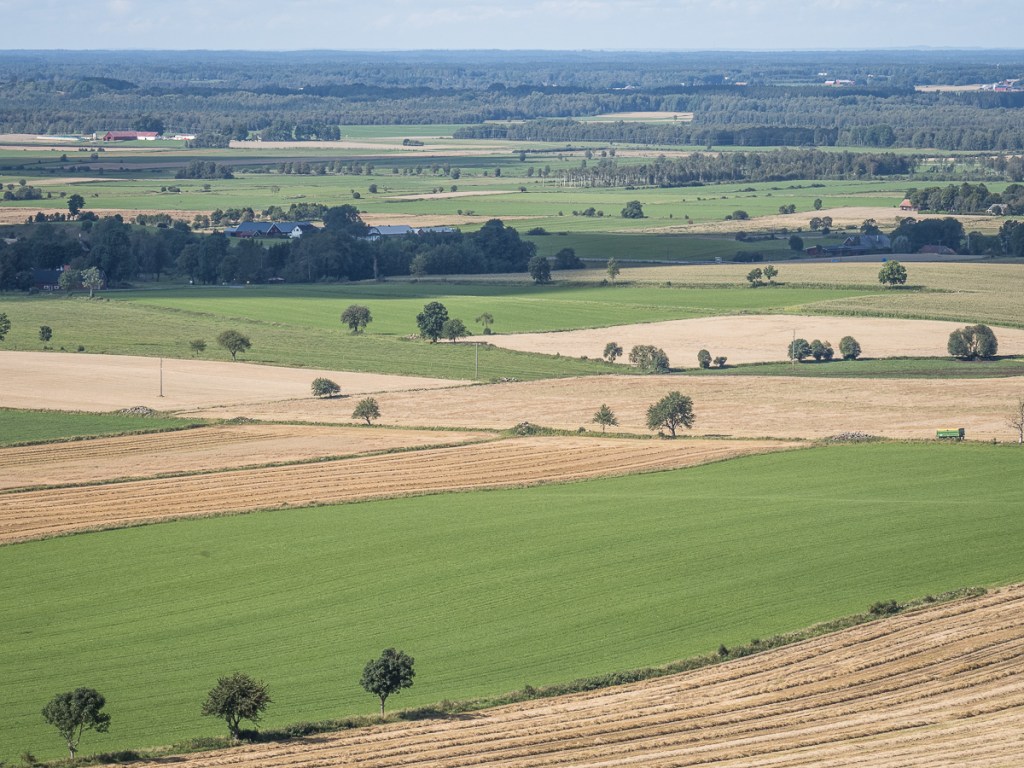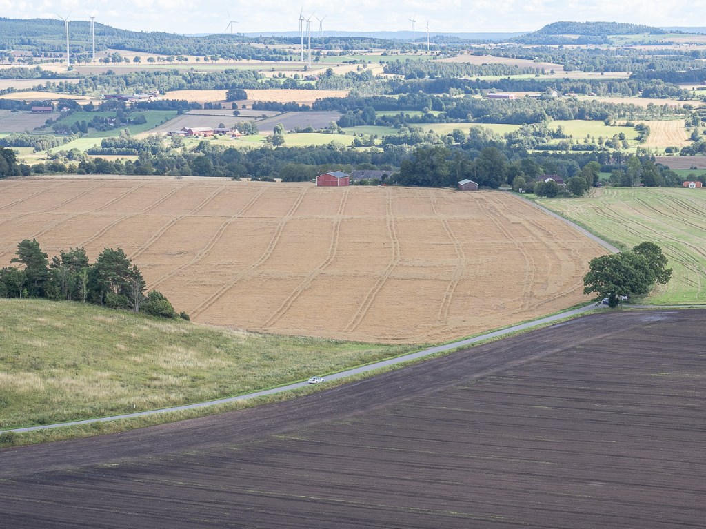 Från Halleberg har man en skön utsikt över de ännu öppna landskapen. Jag gissar att det inte är småbrukare som håller just de vida fälten öppna, det är förmodligen stordrift på hög nivå som gäller här. Står man på den sidan av berget som vetter mot Trollhättan, blir det frampå hösten ett väldigt grafiskt landskap som ger ett lite mer ovanligt men också spännande intryck.