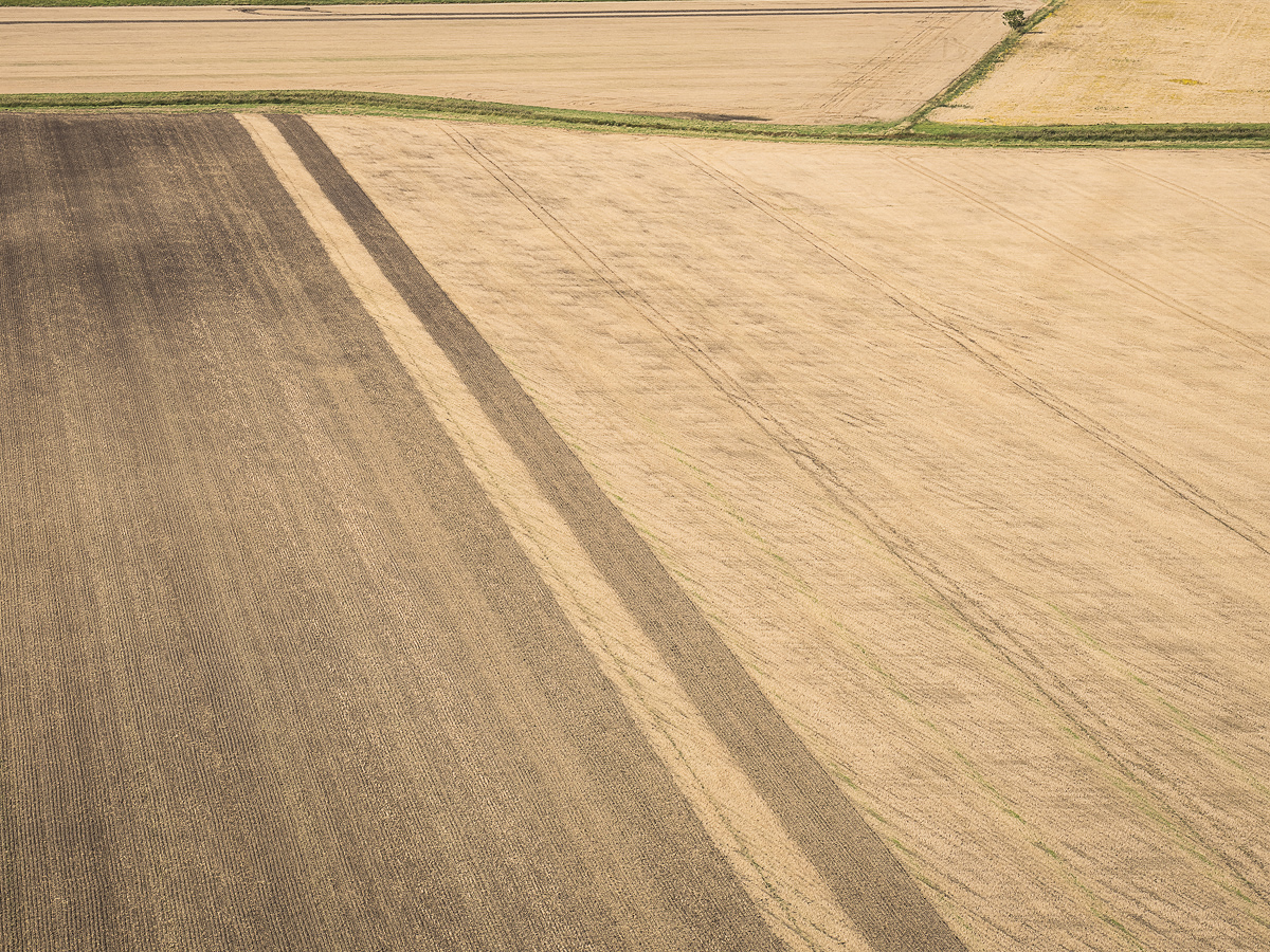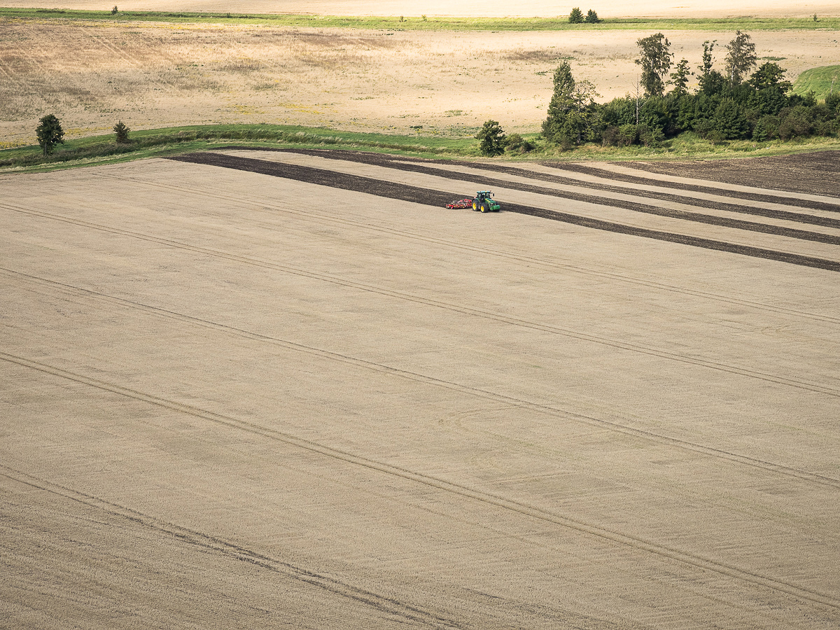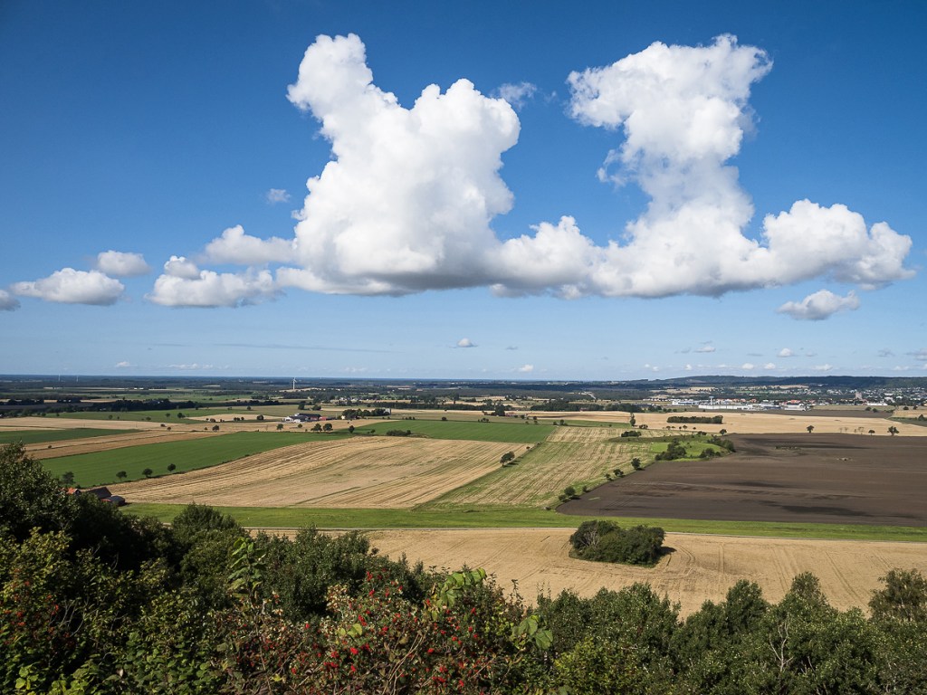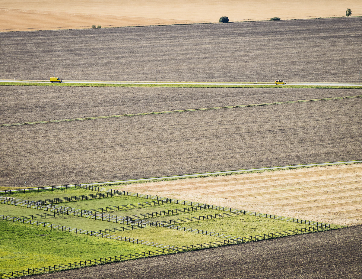 Från Halleberg har man en skön utsikt över de ännu öppna landskapen. Jag gissar att det inte är småbrukare som håller just de vida fälten öppna, det är förmodligen stordrift på hög nivå som gäller här. Står man på den sidan av berget som vetter mot Trollhättan, blir det frampå hösten ett väldigt grafiskt landskap som ger ett lite mer ovanligt men också spännande intryck.