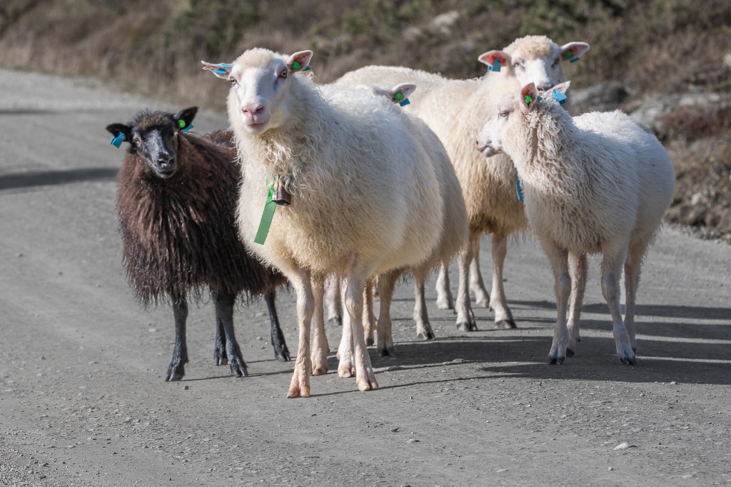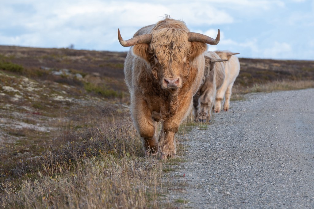Det första vi mötte när vi svängde in mot dalen var ett gäng får som kom ångandes i full fart, det kändes som om de trodde vi var några de kände. När de kommit nära och kunde studera oss noga på lite närmre håll, var det som de förstod att ”nix-detta var inte matte eller husse” och drog sig tillbaka in mot skogen. Färden avslutades med att vi mötte lösgående longhornkor som inte ens bevärdiga oss med en enda blick. Vi hade parkerat vid vägkanten och de valde att gå förbi oss där vi satt i bilen på den trånga insidan av vägen, och gav oss en omedveten knuff när de passerade. Vi förstod vilka krafter de har för de noterade nog inte ens att de knuffat till bilen så den gungade lite.