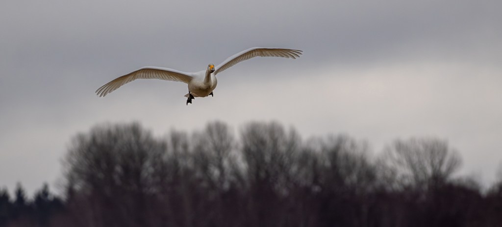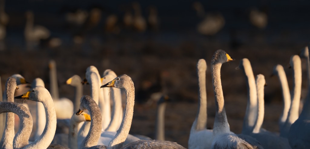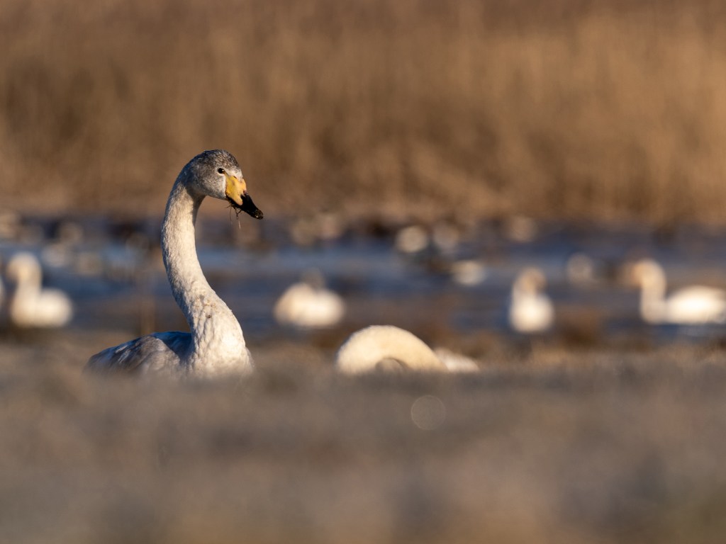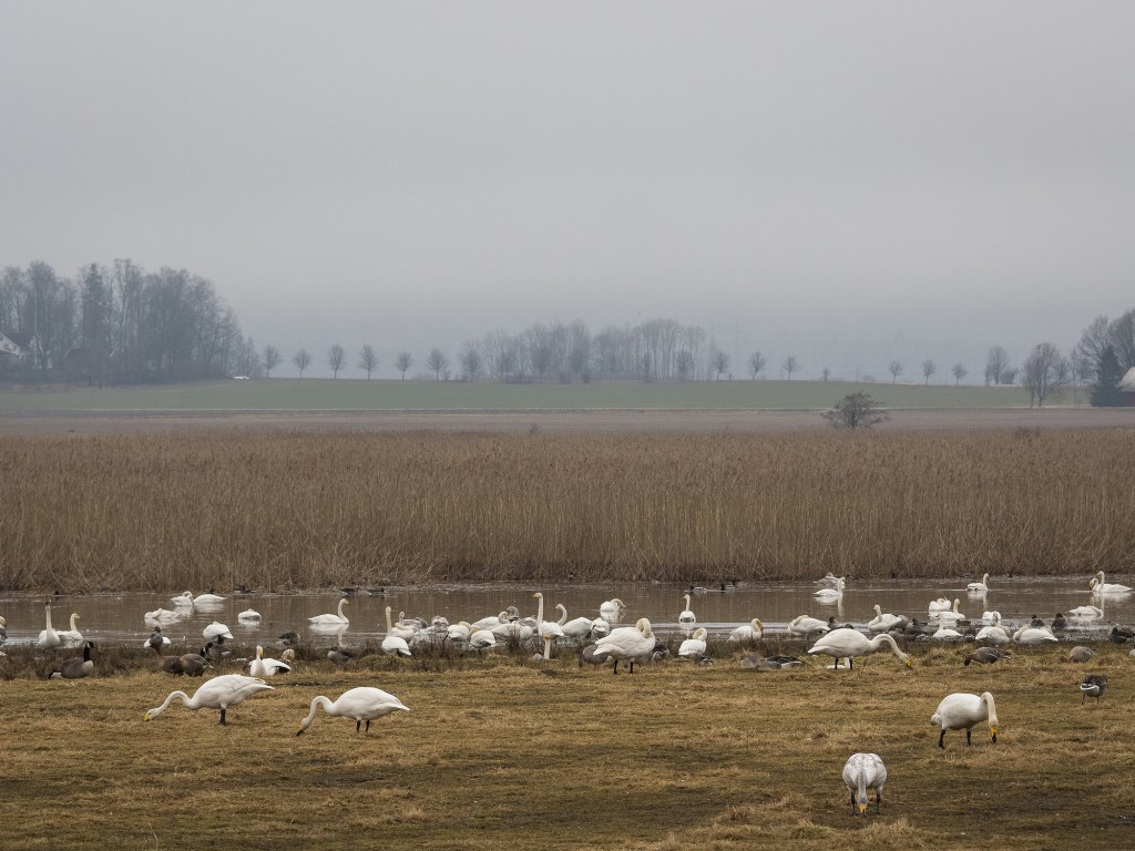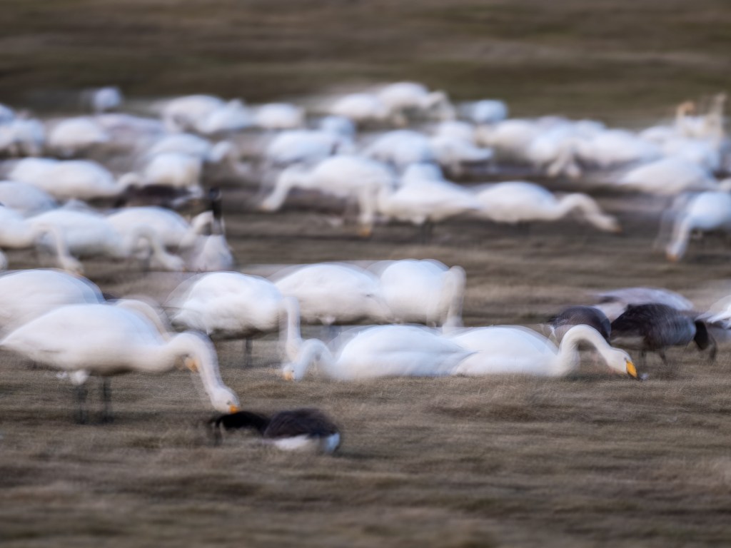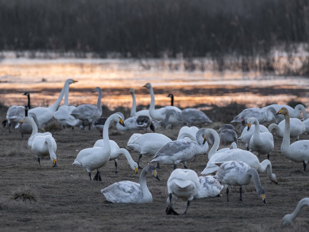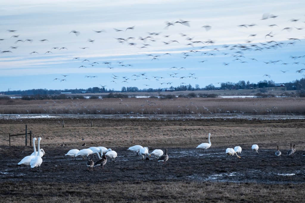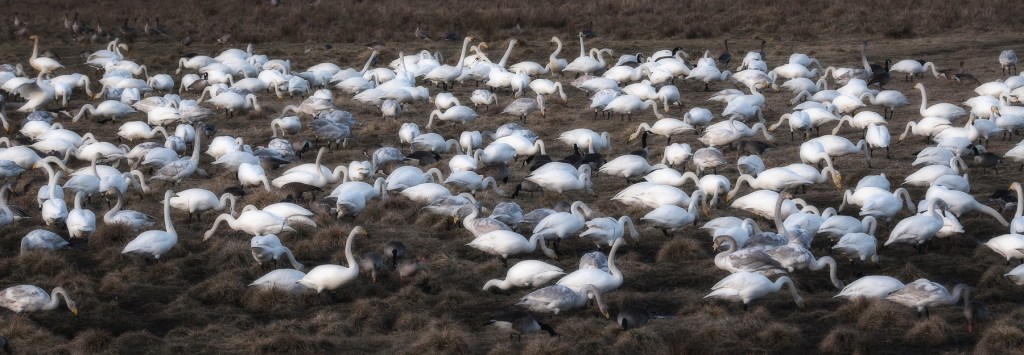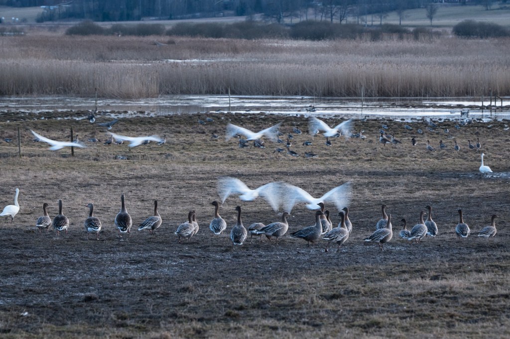 Första dagen vi var där var det väldigt lite aktivitet på platsen, det svanarna gjorde – och för all del alla andra fåglar också – var att beta gräs och äta av maten som en traktor så generöst spridde ut. Det var roligt att se en stor mängd svanar vända sig i samma riktning och i sakta mak dra sig ner till vattnet för att undvika maten som traktorn spreds ut. Ljuset var ingen sensation men helt ok, så det blev ett par bilder som får duga från första kvällen. Antalet svanar har jag inte koll på från denna dagen, men det fanns så det räckte.