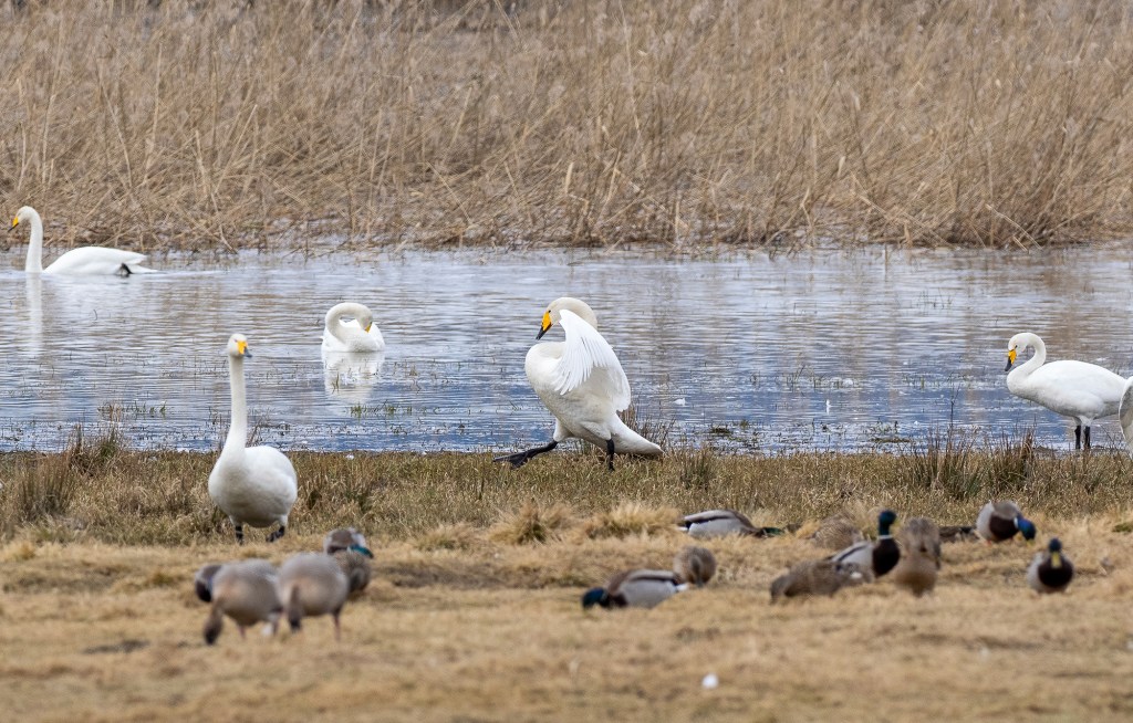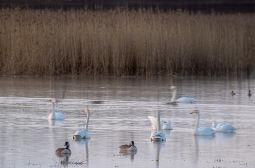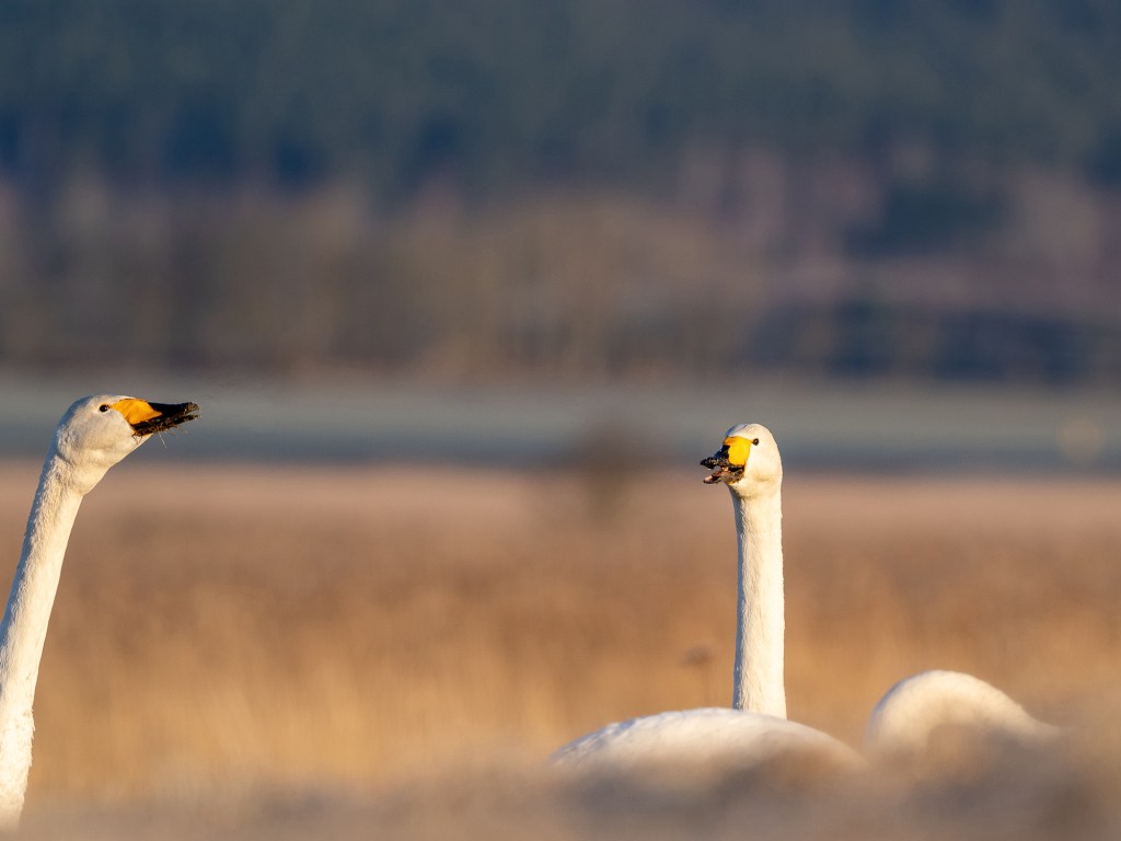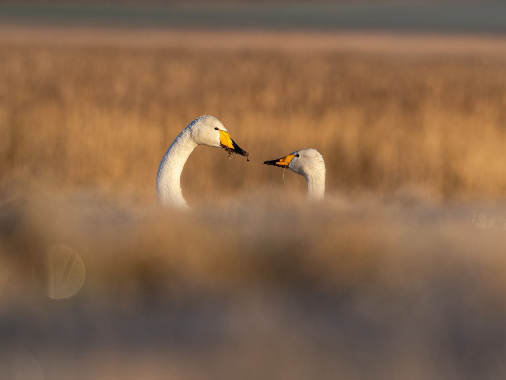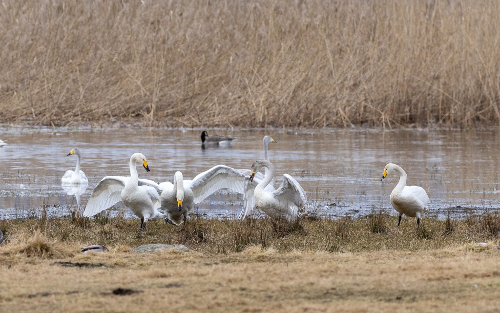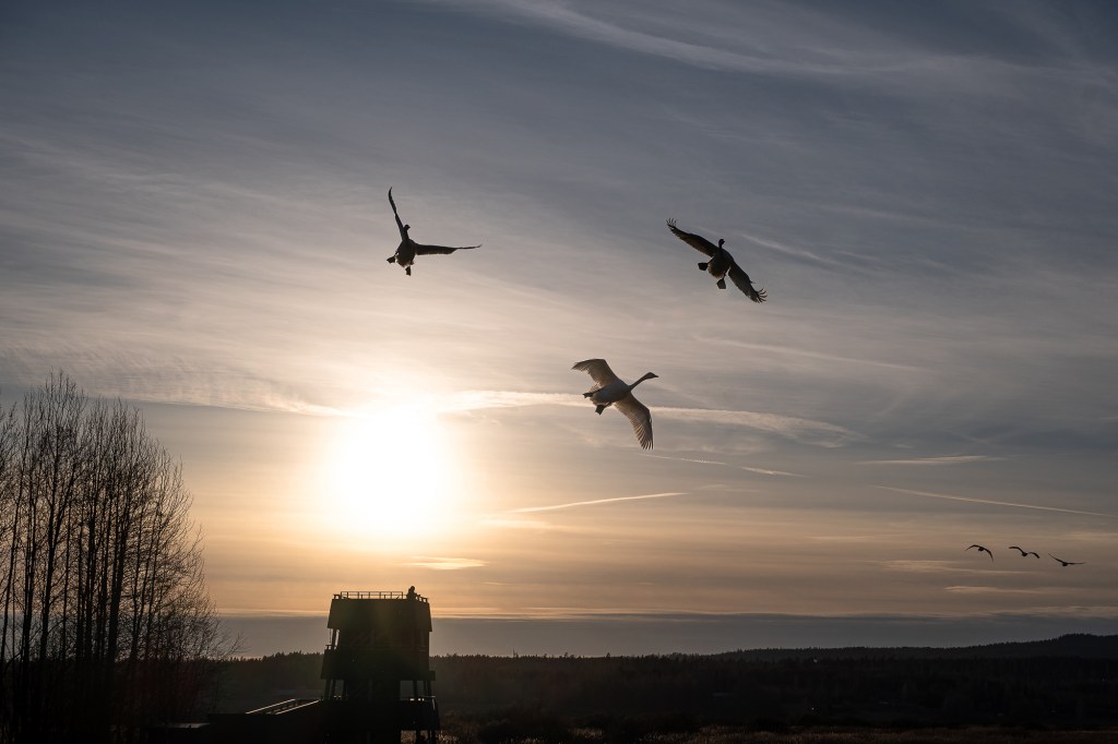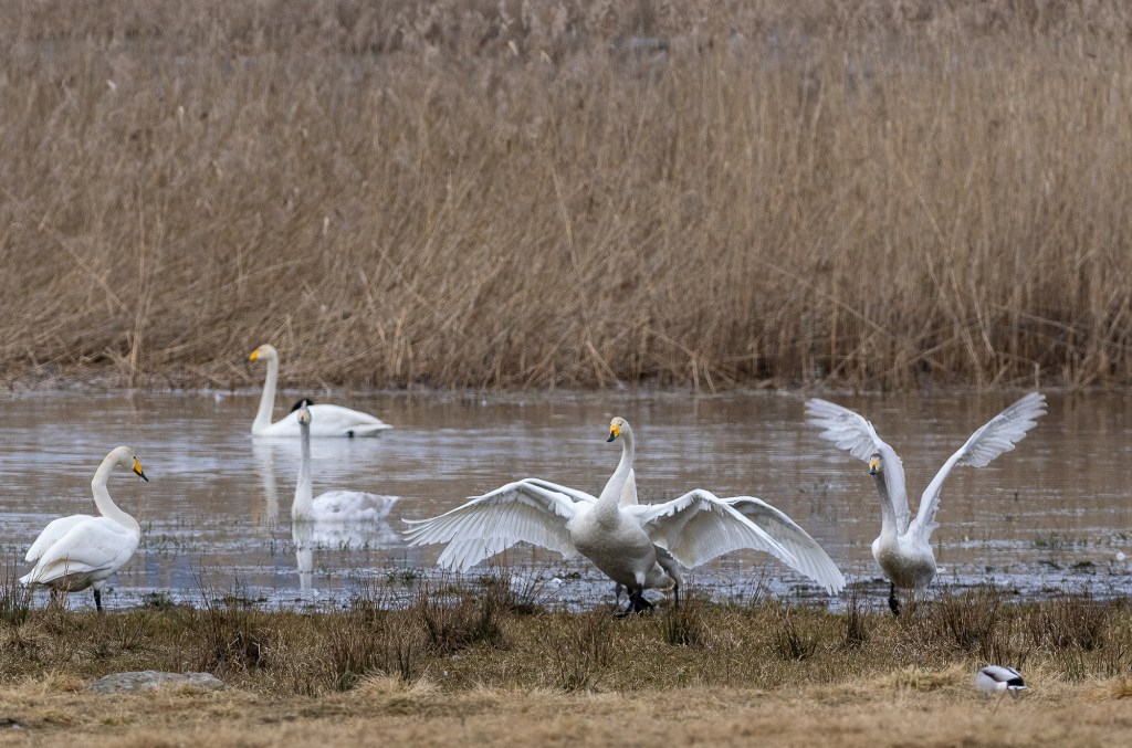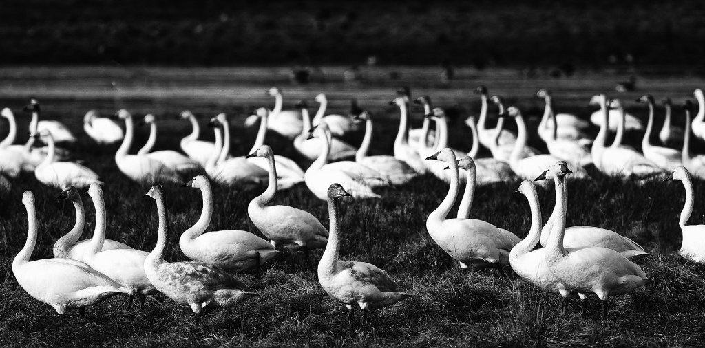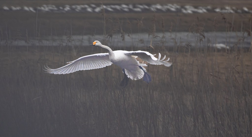 Första dagen vi var där var det väldigt lite aktivitet på platsen, det svanarna gjorde – och för all del alla andra fåglar också – var att beta gräs och äta av maten som en traktor så generöst spridde ut. Det var roligt att se en stor mängd svanar vända sig i samma riktning och i sakta mak dra sig ner till vattnet för att undvika maten som traktorn spreds ut. Ljuset var ingen sensation men helt ok, så det blev ett par bilder som får duga från första kvällen. Antalet svanar har jag inte koll på från denna dagen, men det fanns så det räckte.