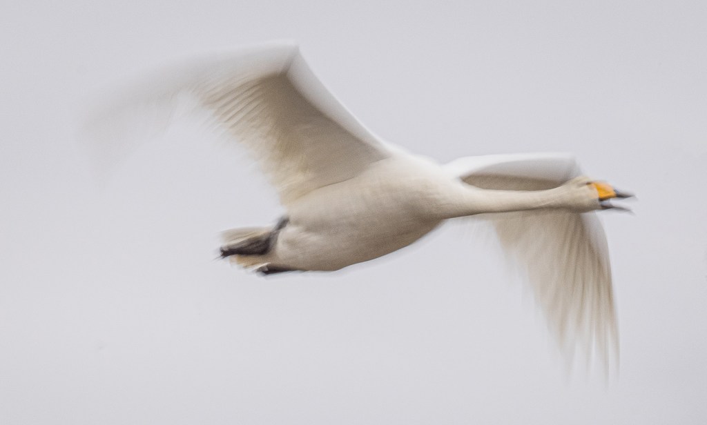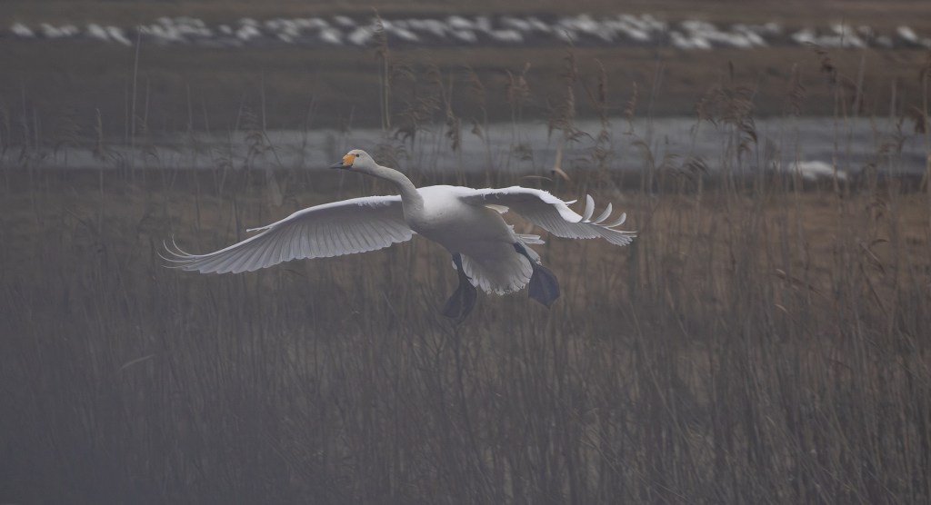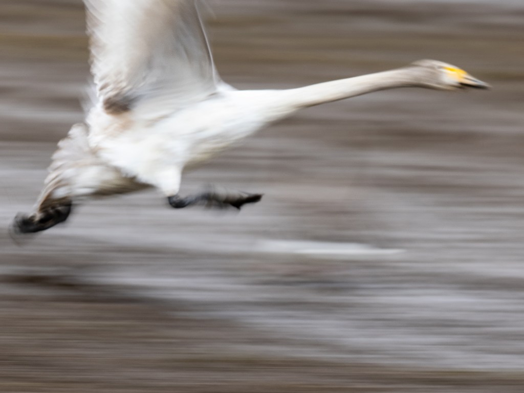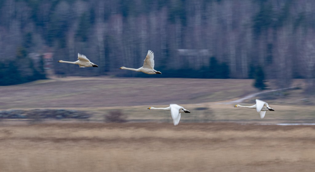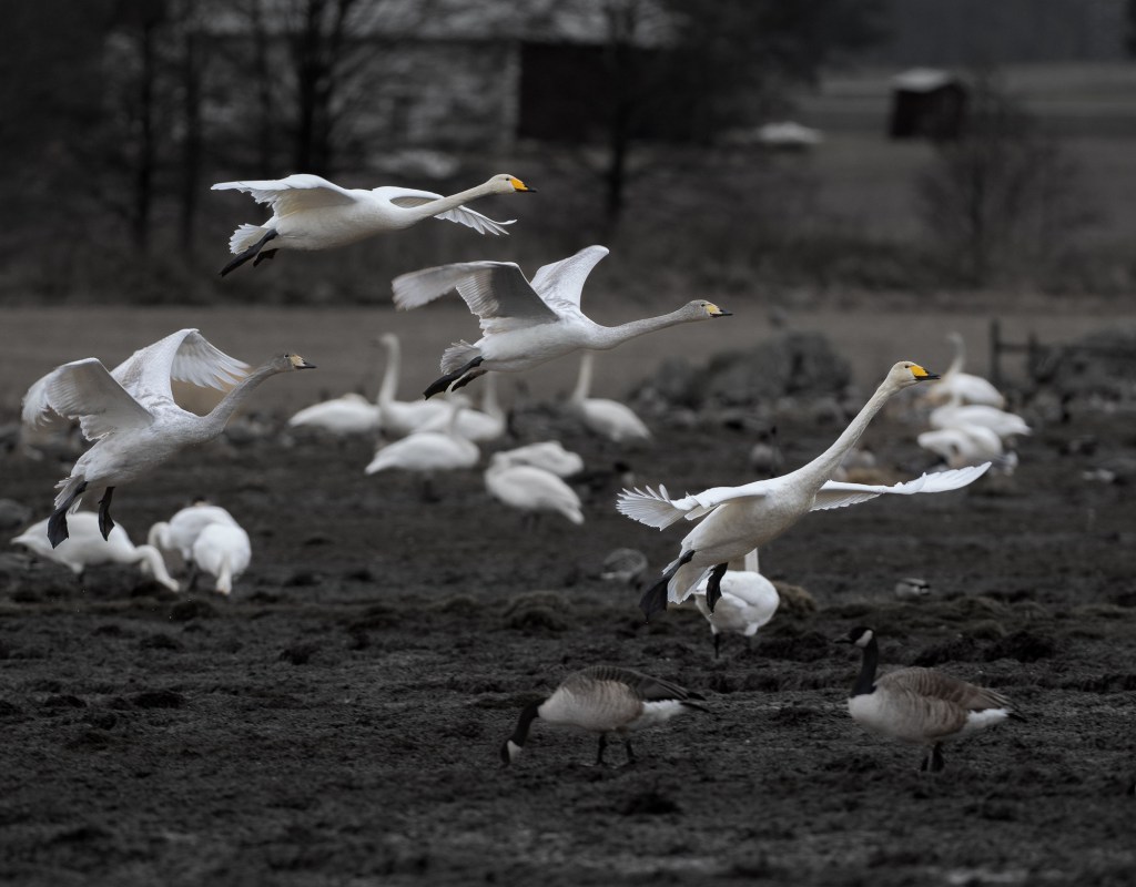 Tredje dagen var gråmulen och en av oss tanter åkte hem efter en morgon visit och fika vid sjön. Det hade kanske vi två kvarvarande tanter också kunnat göra, för vi tyckte inte vi kunde hitta på så mycket mer med bilderna på platsen. Långa slutartider, panoreringar, dubbel exponeringar och annat hyss var så att säga redan utredda. När det fina ljuset saknas blir fotograferingen inte lika givande, även om gråväder i sig kan vara det absolut finaste fotovädret. Det gäller dock mer landskapsbilder än fågelbilder tycker jag. Antalet svanar var nu 2400 om jag minns rätt och det var nu mer aktivitet på plats; flygningar, tjuvnyp till höger och vänster och andra ”roliga” påhitt som var lite kul att få se.