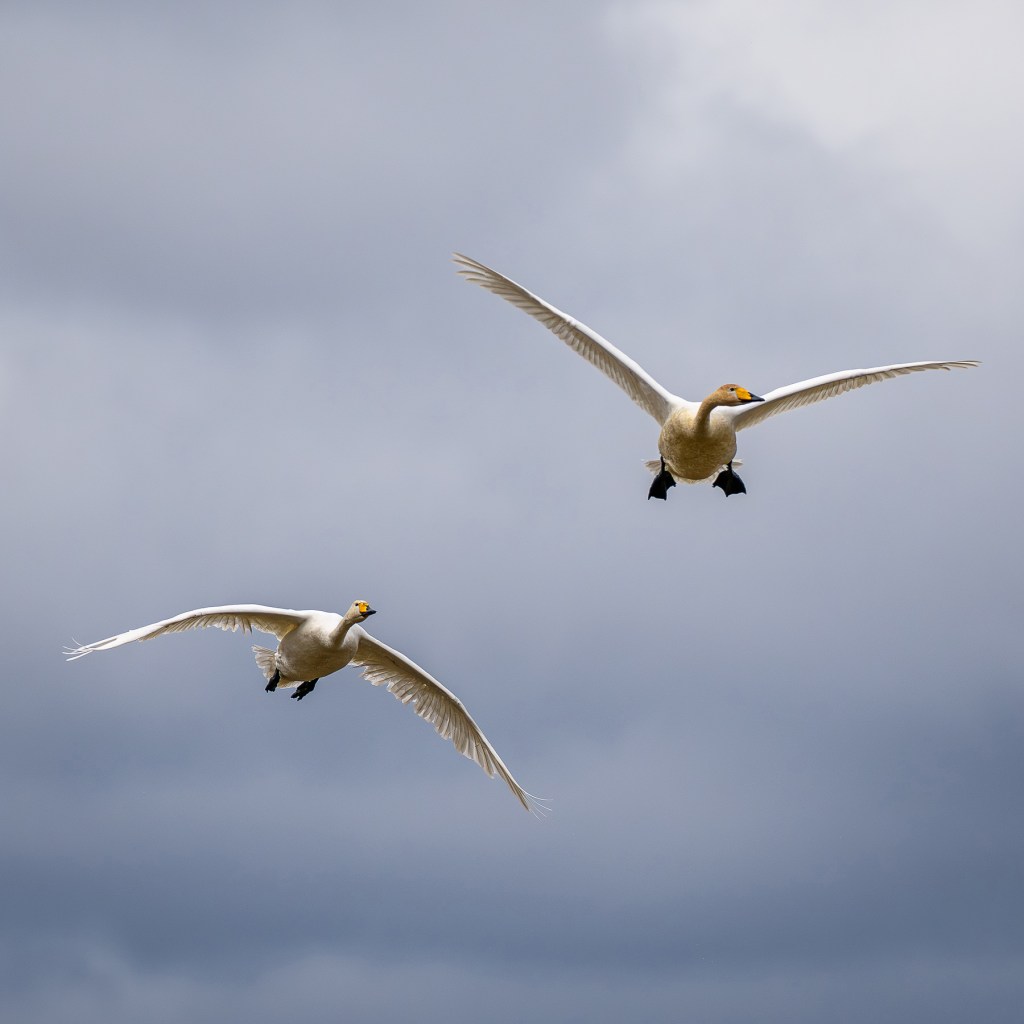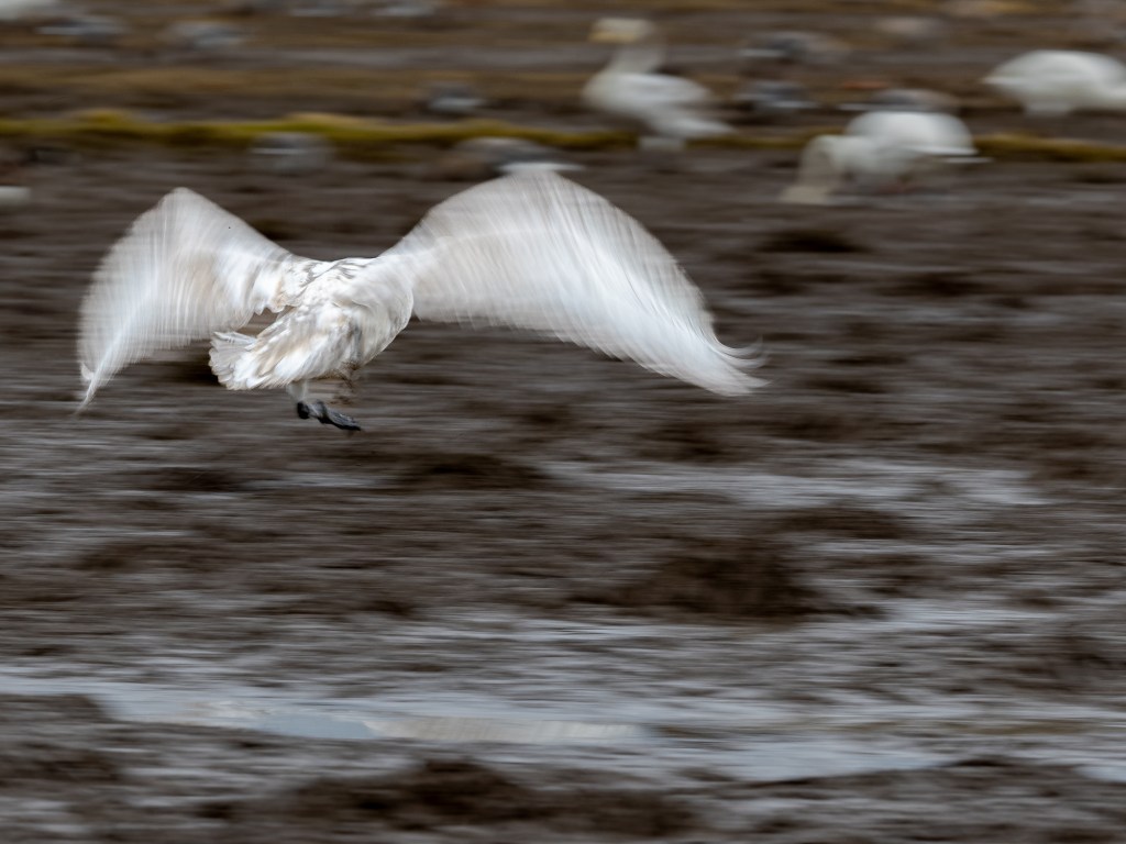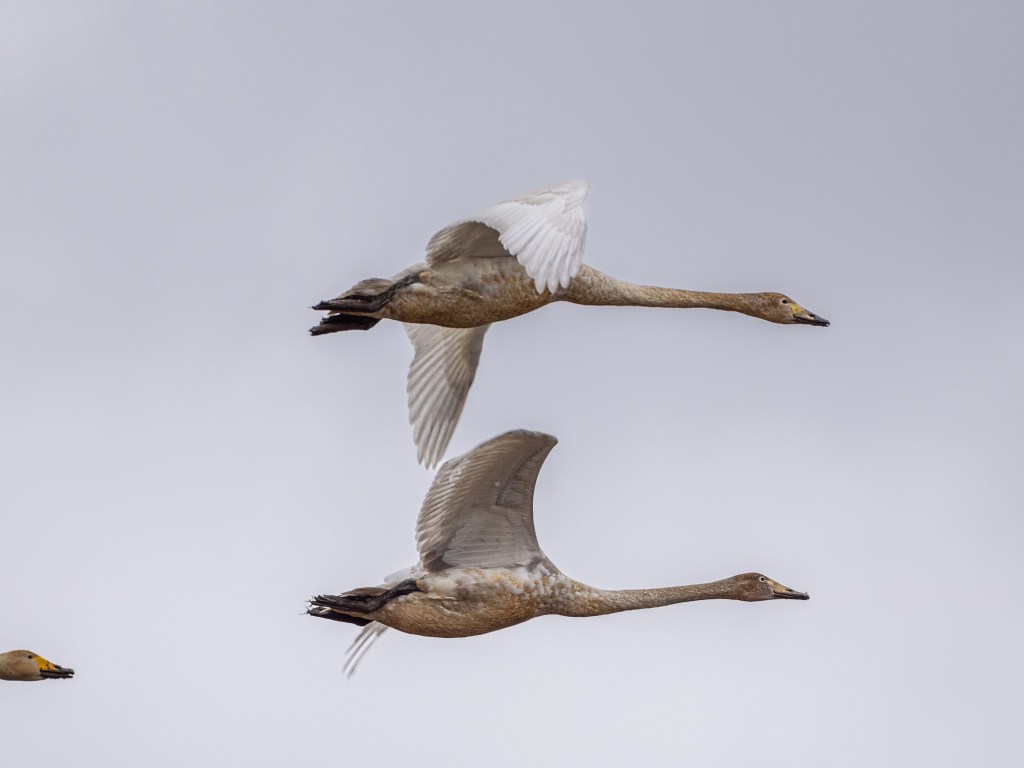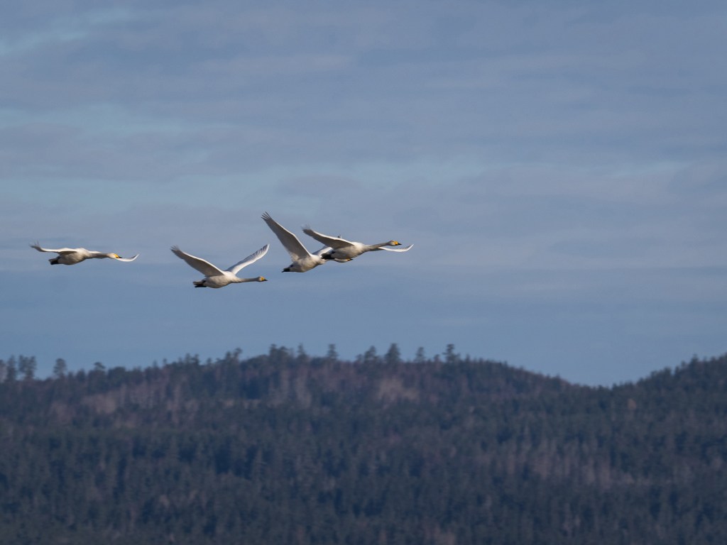 Tredje dagen var gråmulen och en av oss tanter åkte hem efter en morgon visit och fika vid sjön. Det hade kanske vi två kvarvarande tanter också kunnat göra, för vi tyckte inte vi kunde hitta på så mycket mer med bilderna på platsen. Långa slutartider, panoreringar, dubbel exponeringar och annat hyss var så att säga redan utredda. När det fina ljuset saknas blir fotograferingen inte lika givande, även om gråväder i sig kan vara det absolut finaste fotovädret. Det gäller dock mer landskapsbilder än fågelbilder tycker jag. Antalet svanar var nu 2400 om jag minns rätt och det var nu mer aktivitet på plats; flygningar, tjuvnyp till höger och vänster och andra ”roliga” påhitt som var lite kul att få se.