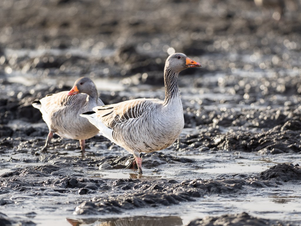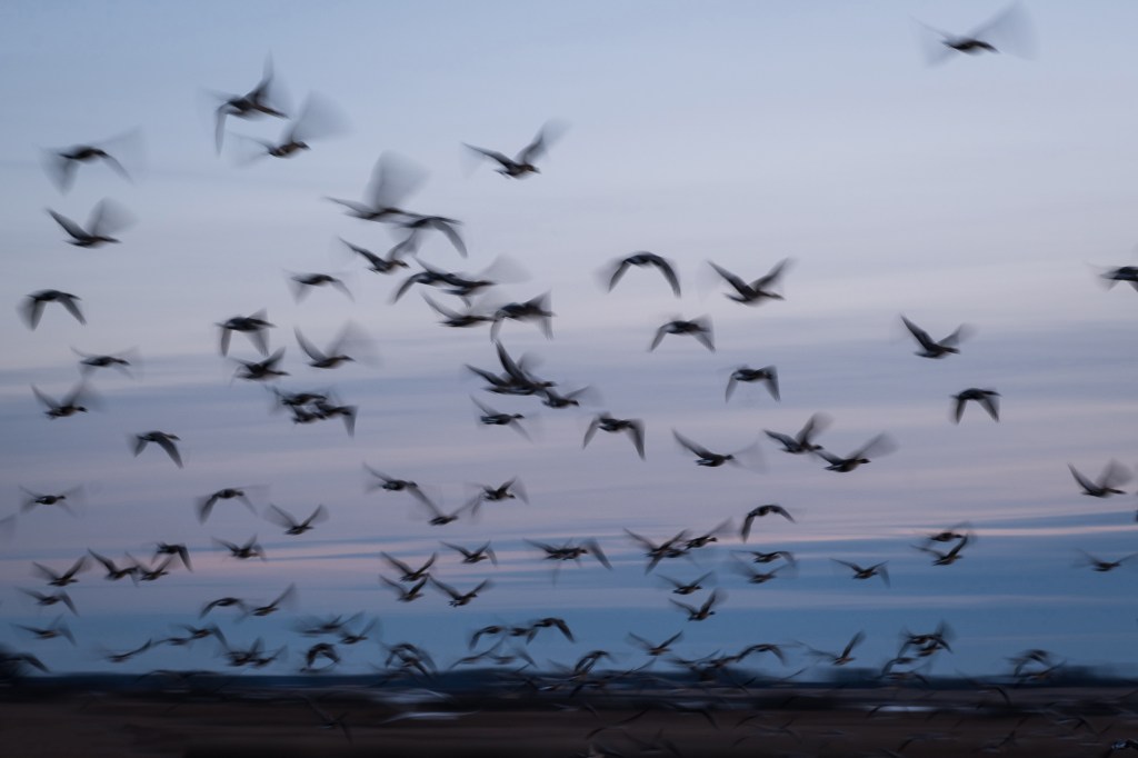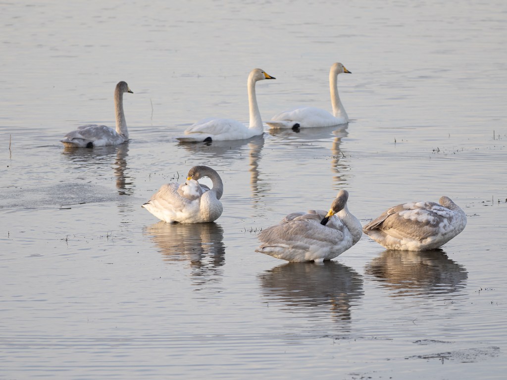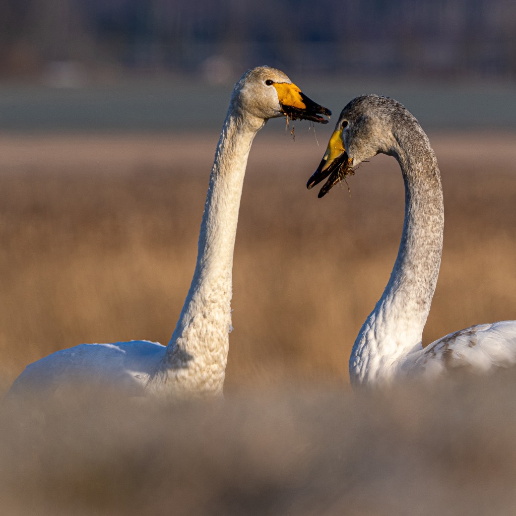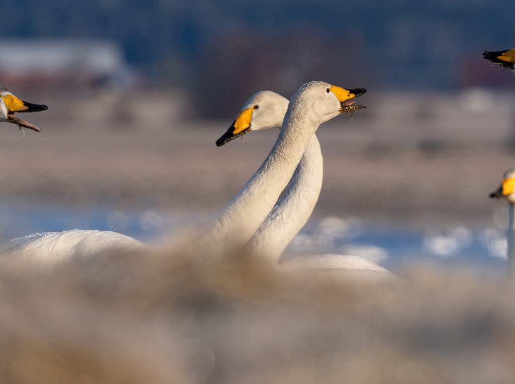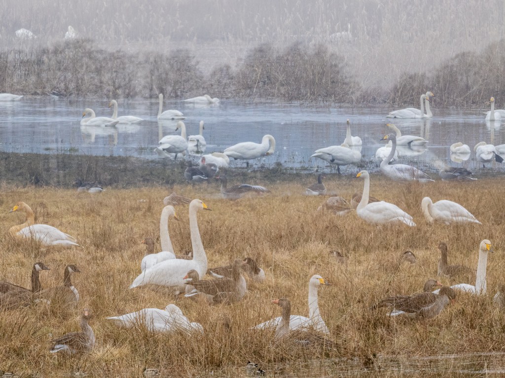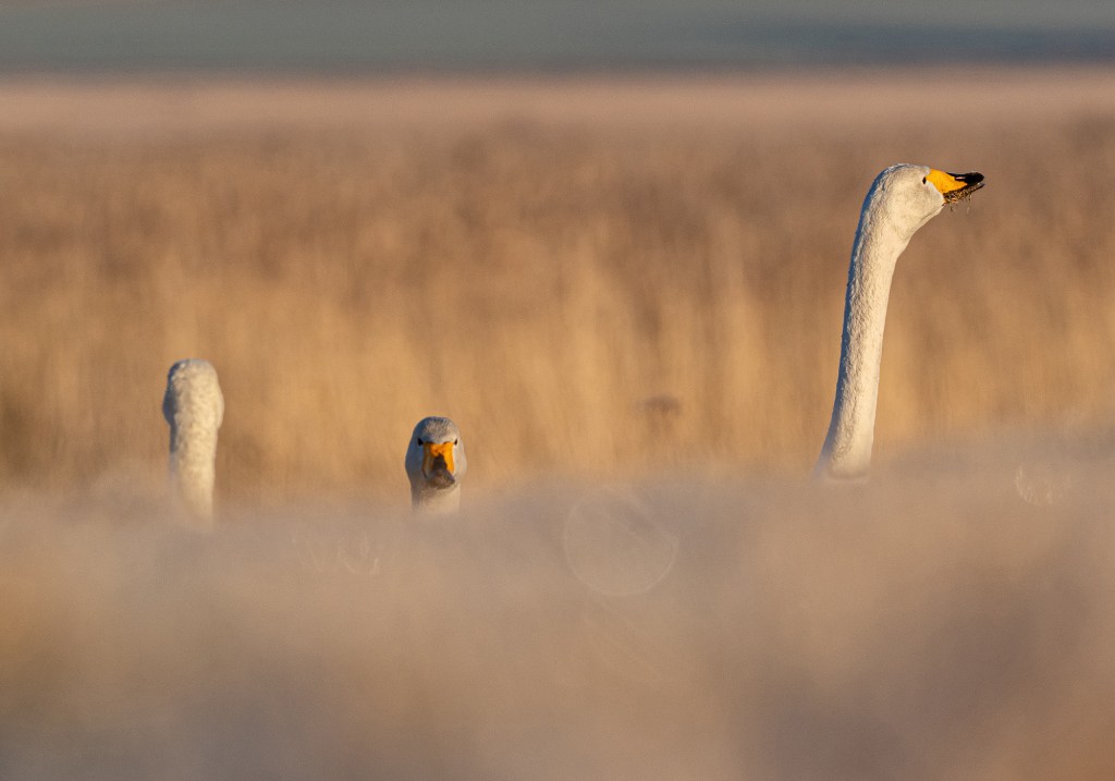 Andra dagen stack vi ut tidigt för att kanske få se de stora inflygningarna i gryningen jag hört talas om, men se av det blev det inget. Svanarna låg i vattnet eller på åkrarna på samma vis som de gjorde kvällen innan. Lite snopet. Morgonen bjöd ändå på lite fint ganska mjukt soligt väder, så den ägnades åt att ligga på mage längs vägkanten, där det fanns en liten kulle som svanarna stod nedanför. Det blev en hel del svanhalsar som stack upp över kanten som fastnade på minneskorten för oss alla den morgonen :) Det var höjdpunkten sett ur fotoperspektivet från resan tycker jag. Lite goa skratt när resultaten från minneskorten studerades i datorn på kvällen. Lite mindre goa skratt när man anade hur många bilder som måste raderas från samma kort…Antal svanar dag två var närmare 2000 stycken om jag minns rätt, men det är ingen garanti. Antalet gäss tror jag inte var noterat men de var många de också.