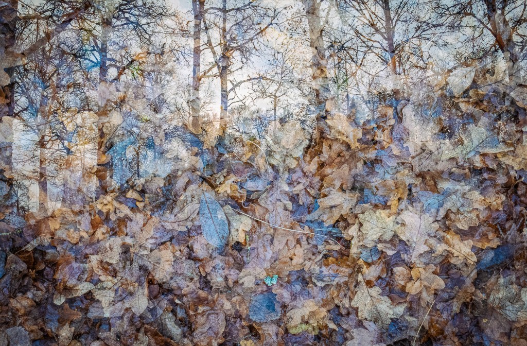 Nåväl, det var runt den ganska stora kullen jag gick denna halvmolniga novemberdag och ”sparkade omkling i löven”. Nedfallna höstlöv tilltalar mig mycket och jag tänkte att jag kunde passa på och ordna en novemberbild till Bitterna almanackan. Bilden gjorde jag genom en dubbelexponering direkt i kameran. Jag minns nu inte om jag först fotade rakt upp mot himlen och sedan ner i löven, eller om det var tvärtom. Resultatet blev jag i vilket fall som helst nöjd med, och jag vet att många andra också uppskattar bilden.