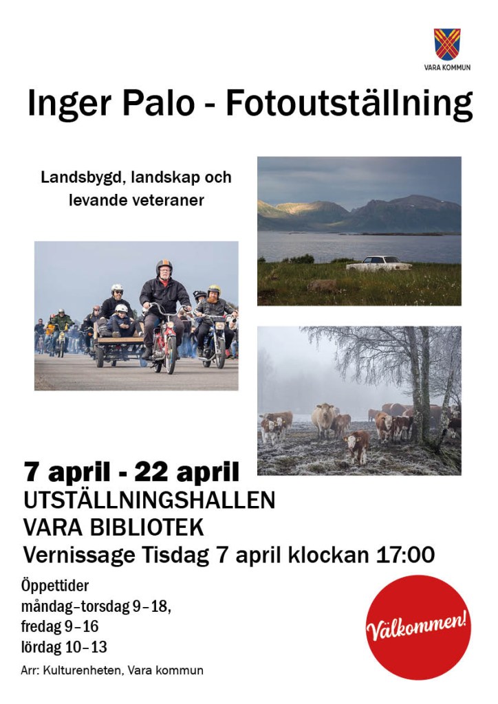 En vänlig påminnelse om att det snart är dags för Vernissage av min utställning på Vara Bibliotek: ”Landsbygd, Landskap och Levande Veteraner”. VÄLKOMNA!